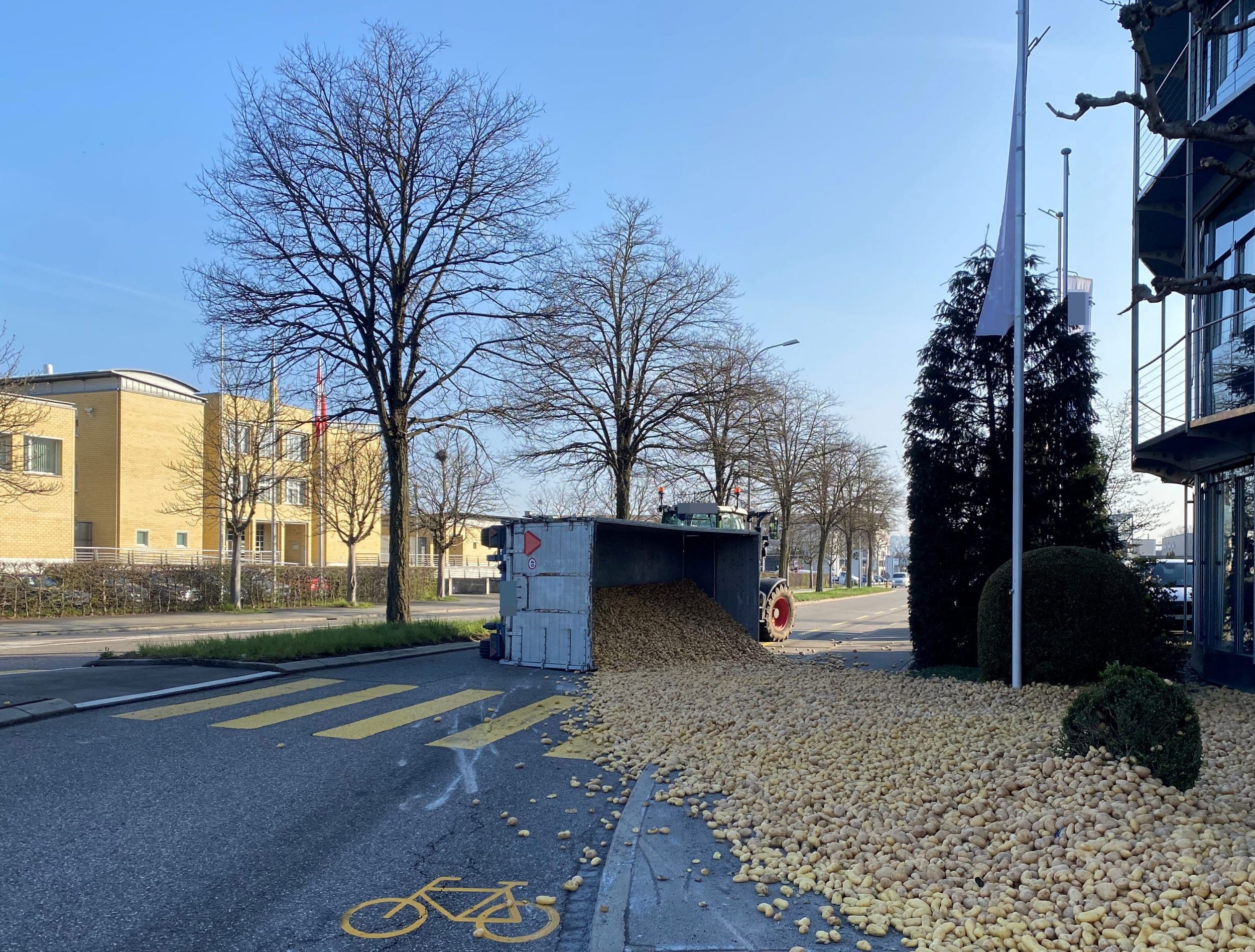 Tausende von Kartoffeln verteilten sich auf der Strasse und dem angrenzenden Trottoir. Der Sachschaden wird auf mehrere tausend Franken beziffert. Beim Unfall kam niemand zu Schaden.