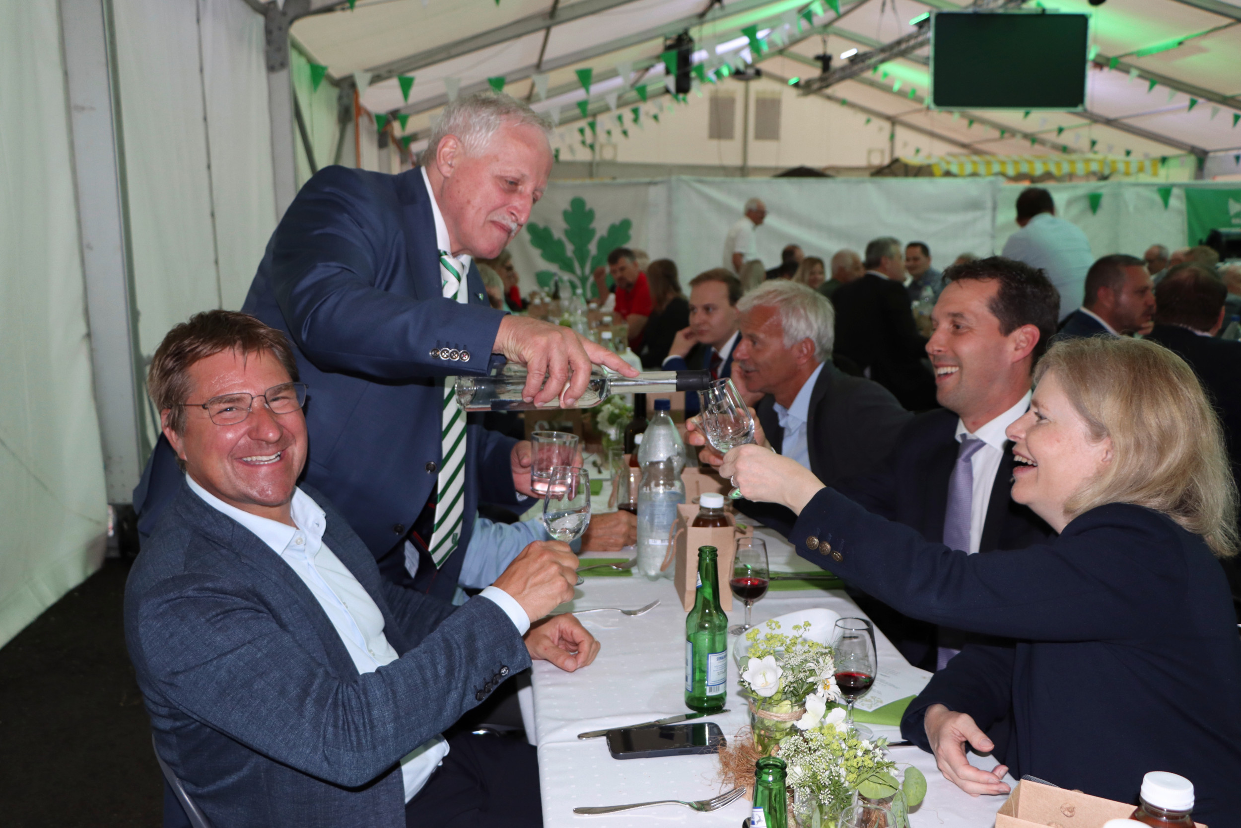 Gesellig, bodenständig und volksnah: Kantonsratspräsident Walter Freund schenkt an seinem Empfangsfest den selbst gebrannten Edelbrand aus. Alt-Nationalrat Toni Brunner, Ständerätin Esther Friedli und Nationalrat Michael Götte freuts.