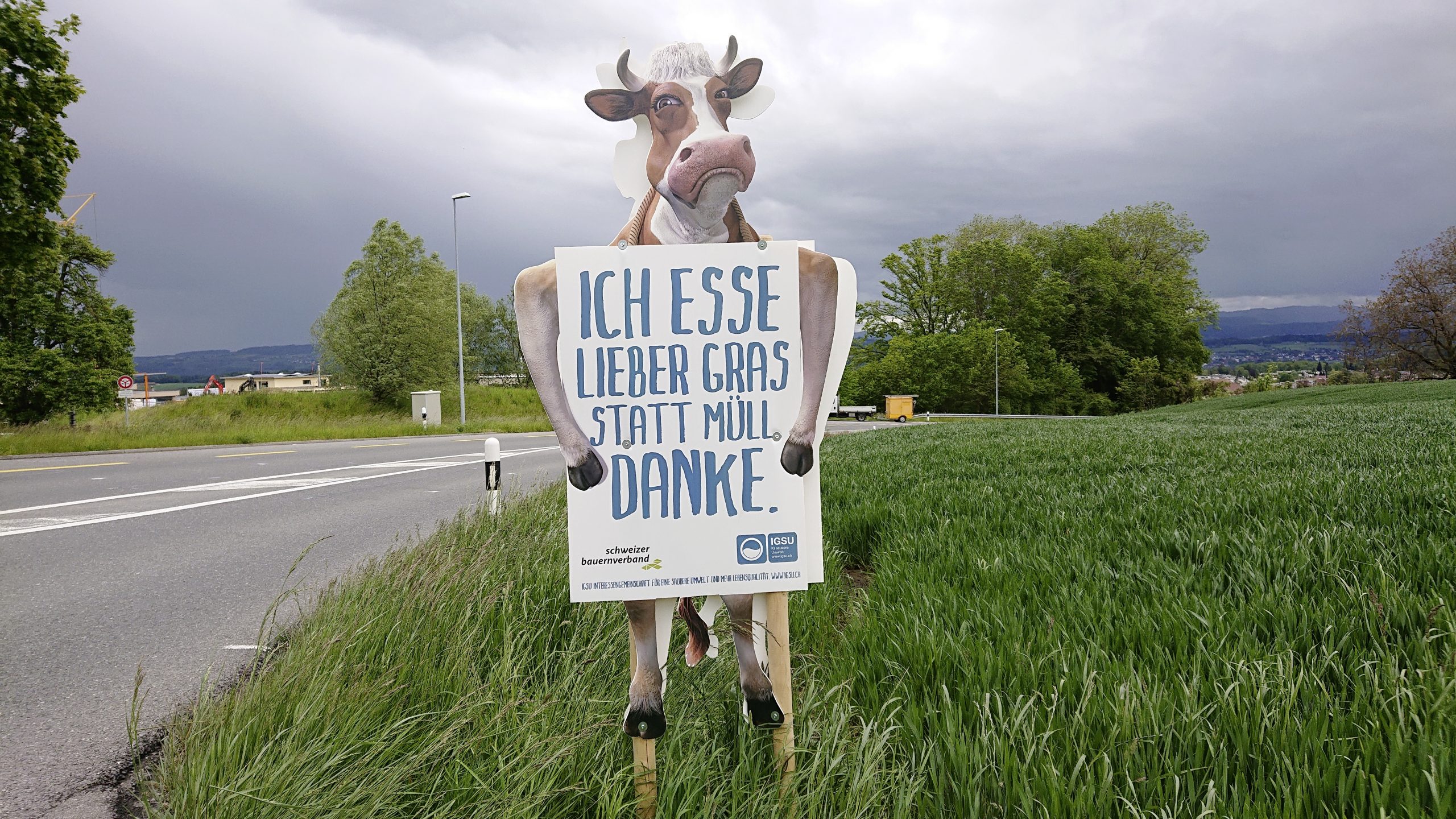 Verteilt über den dichtbesiedelten Kanton stehen an über 50 Standorten entlang vielbefahrener Strassen die Plakate einer «sprechenden Kuh», die darauf hinweist, dass sie lieber Gras statt Müll isst.