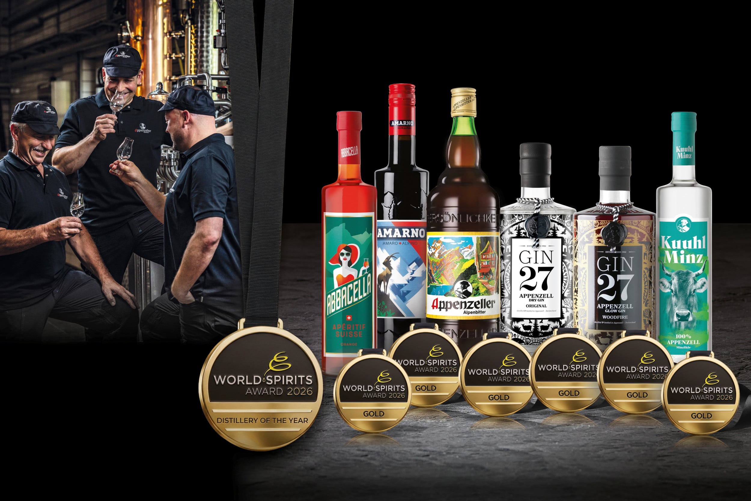 Acht Produkte der Appenzeller Alpenbitter AG wurden beim World-Spirits Award 2026 mit Gold und Silber ausgezeichnet.