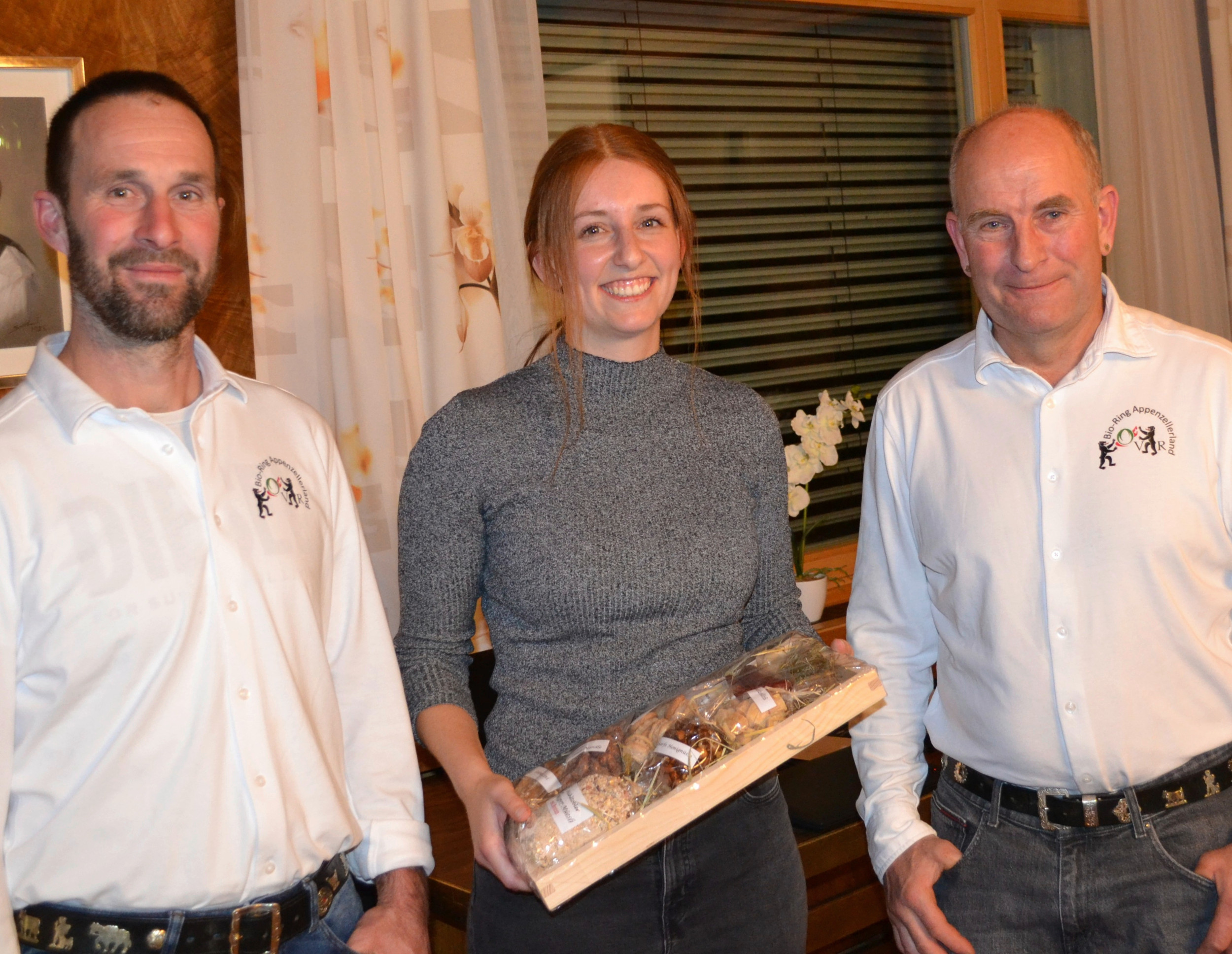 Nadine Trottmann erhält von Präsident Koni Meier (rechts) und Vorstandsmitglied Andreas Zuberbühler ein Präsent.