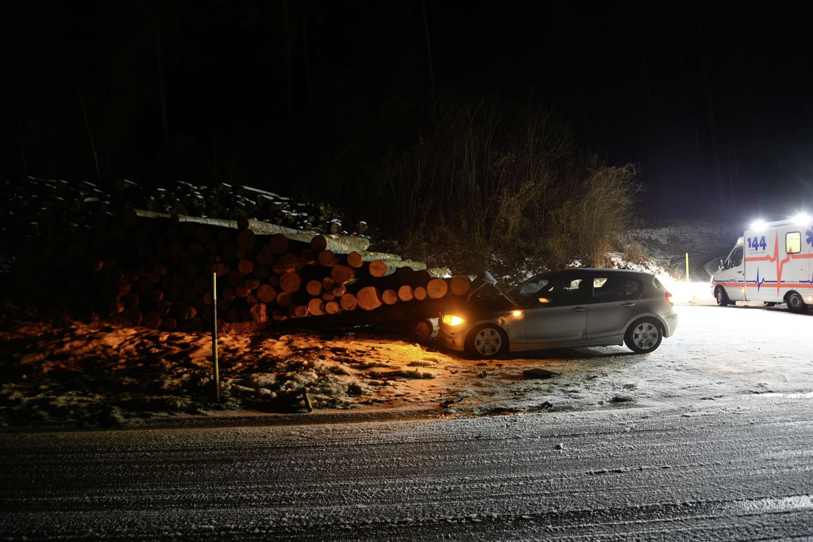 Eine 22-jährige Personenwagenlenkerin fuhr zusammen mit drei Kollegen um 4 Uhr morgens auf der Italienischen Strasse von Rhäzüns in Richtung Rothenbrunnen. In einer Linkskurve rutschte das Fahrzeug auf der vereisten Strasse geradeaus über einen Holzlagerplatz und prallte in die dort gelagerten Baumstämme.