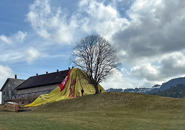 Dabei kam es zum Malheur. Der Ballon wurde wieder leicht angehoben und von den ausgestiegenen Passagieren Richtung Strasse geschoben. Auf der Strasse erfasste eine Windböe den Heissluftballon. Der Korb legte sich auf die Seite. Nach der Entleerung bedeckte ein Teil der Hülle das Stalldach.