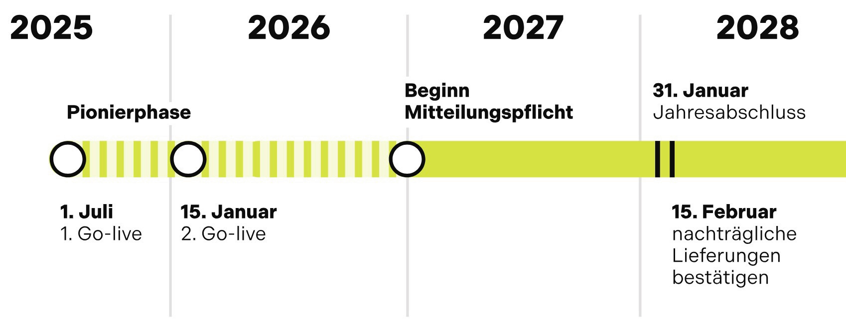 - 1. Januar 2027: Meldepflicht für die berufliche Anwendung von Pflanzenschutzmitteln – mit Übergangsregelung. Betriebe bestätigen PSM-, Dünger- und Kraftfutter-Lieferungen. Um den PSM-Jahresverbrauch zu ermitteln, werden die PSM-Lieferungen und der Endjahresbestand anschliessend miteinander verrechnet. Bis zum 31. Januar 2028 können Händler Lieferungen von PSM, Dünger und Kraftfutter aus dem Vorjahr eingeben. Bis zu diesem Zeitpunkt können Landwirtschaftsbetriebe zudem den Lagerbestand von PSM per Ende des Vorjahrs erfassen.
