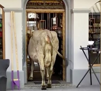 Dort schaute sie sich um. Doch die verschiedenen Düfte und die Einrichtung waren ihr doch ein wenig suspekt. Denn im Laden war es eng, die Kuh konnte sich nur mit Mühe durch die Regale bewegen. Nach rund einer Minute konnte der Senn die Kuh schliesslich wieder ins Freie führen.