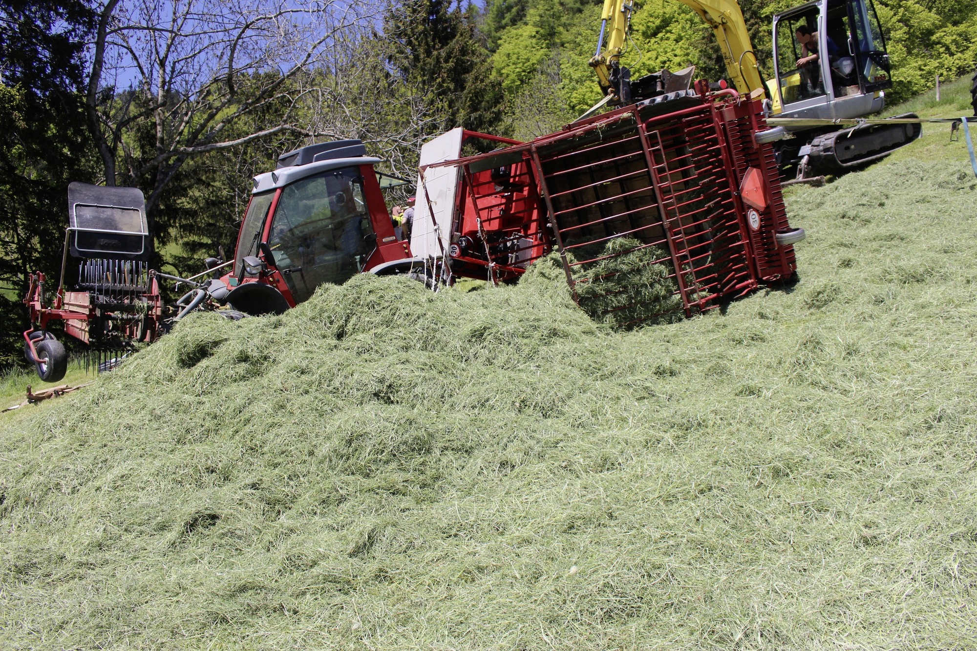 Auf der steilen Wiese kippte das Fahrzeug aus noch unbekannten Gründen auf die Seite. Dabei klemmte sich der junge Landwirt das Bein zwischen der Führerkabine und der Wiese ein.