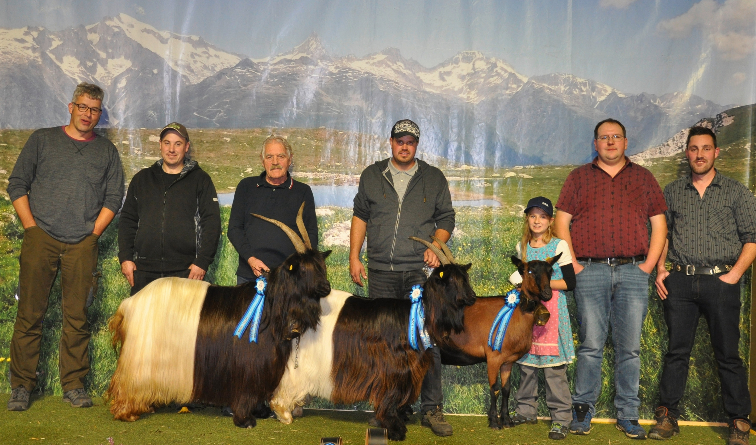 Uly Schnydrig mit der Miss Visp Katia, David Bittel mit der Miss Schwarzhalsziege Jüngere Saba und die Miss andere Rassen Palma der Familie Schnydrig (v. l.) flankiert von den Experten.