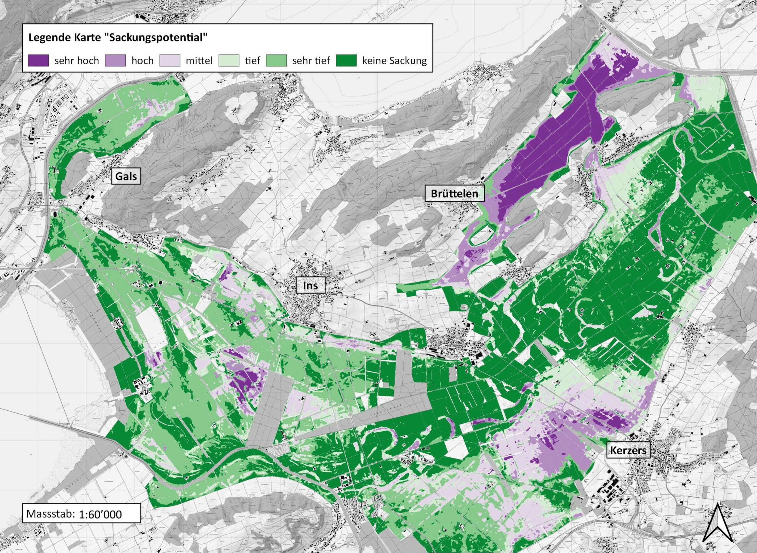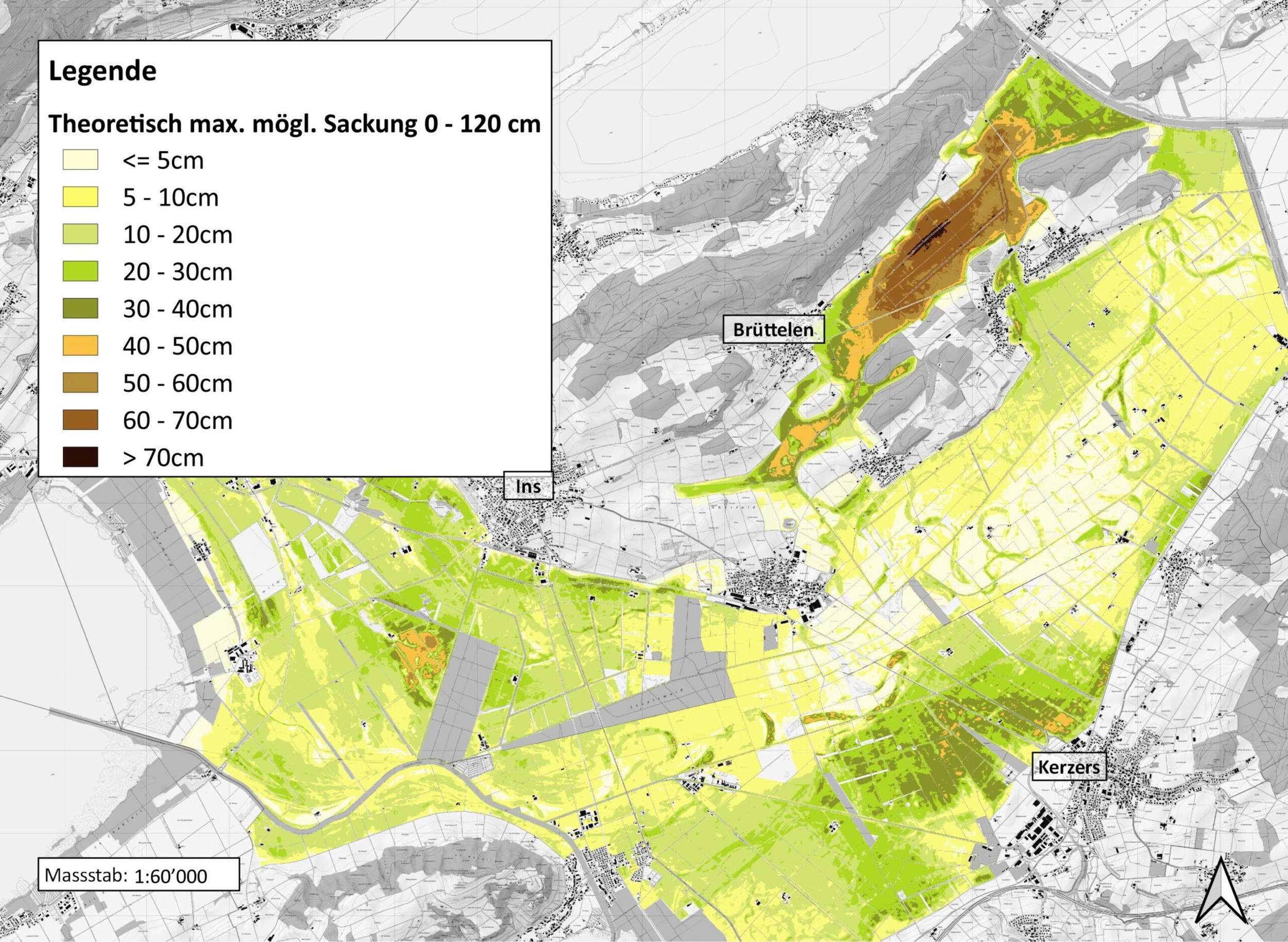 Mit dem Projekt BOKA wurde das Grosse Moos kartiert. Je dunkler die Farbe desto höher wird die theoretisch mögliche Sackung sein. Bei der Gemeinde Brüttelen ist das Sackungspotenzial besonders hoch.