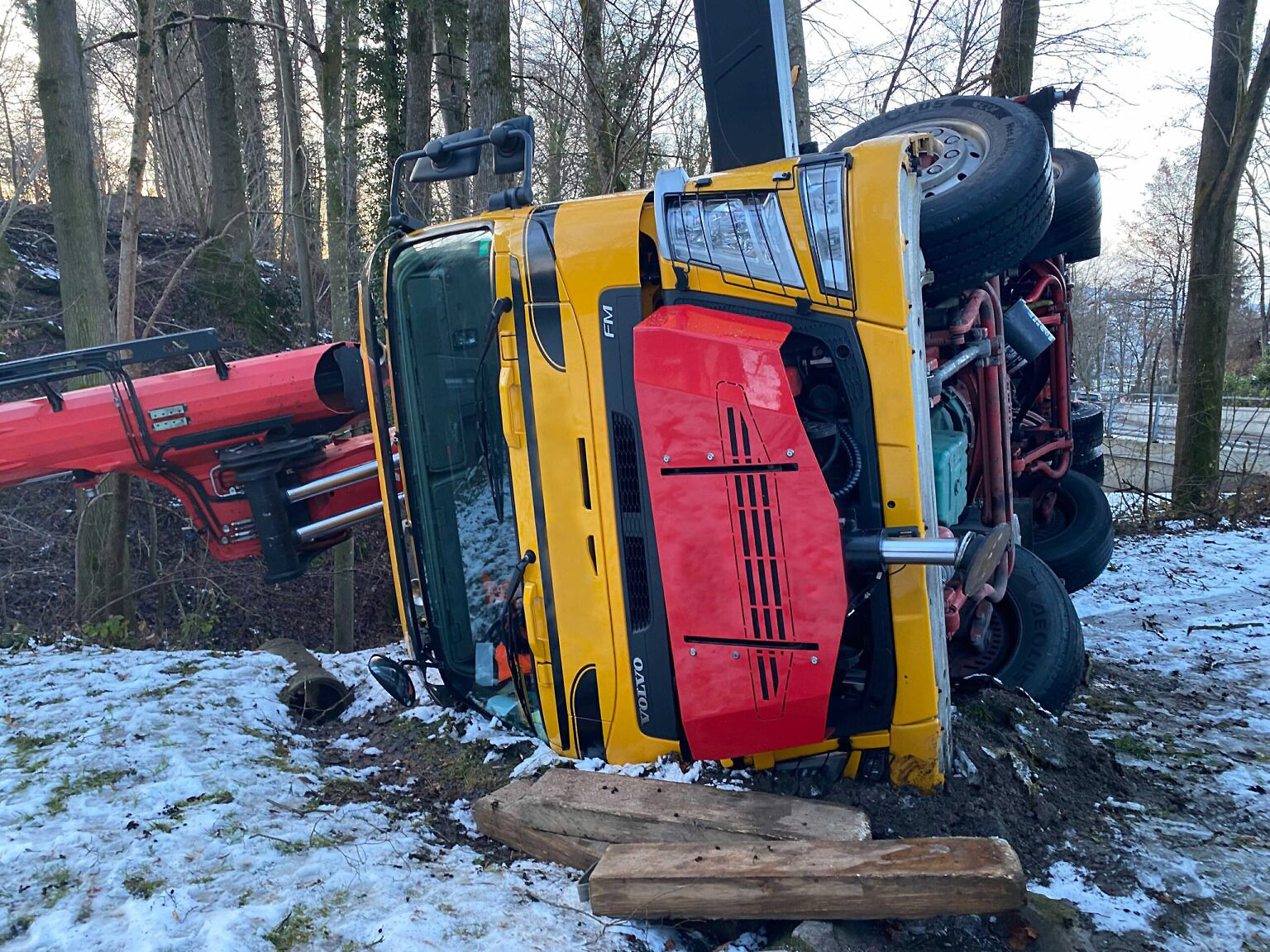 Gemäss Angaben der Polizei ereignete sich der Vorfall kurz vor 16.30 Uhr beim Spielplatz Burg. Ein abgesägter Baum wurde mit dem Kran angehoben. Aus noch unbekannten Gründen kippte die Maschine um und kam auf der rechten Fahrzeugseite liegend zum Stillstand.