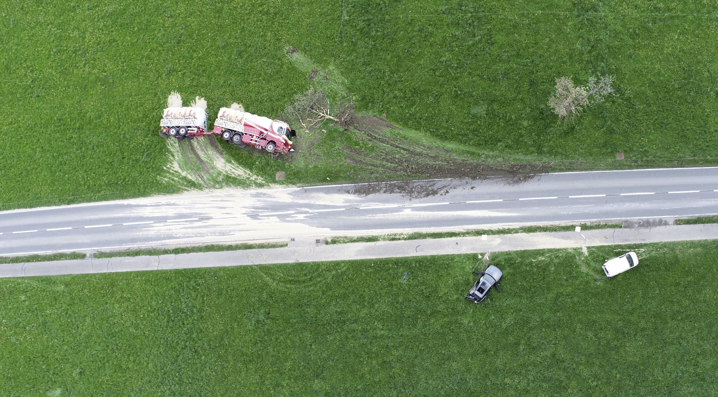 Es entstand Landschaden – der Baum knickte durch die Wucht des Zusammenpralls um. Zudem trat aus dem Anhängerzug ein Teil der Ladung aus. In der Wiese gab es deutliche Spuren durch die Kollision. Zur Höhe des Sachschadens an Fahrzeugen und am Land machte die Polizei keine Angaben. Die Strasse blieb während mehreren Stunden gesperrt.