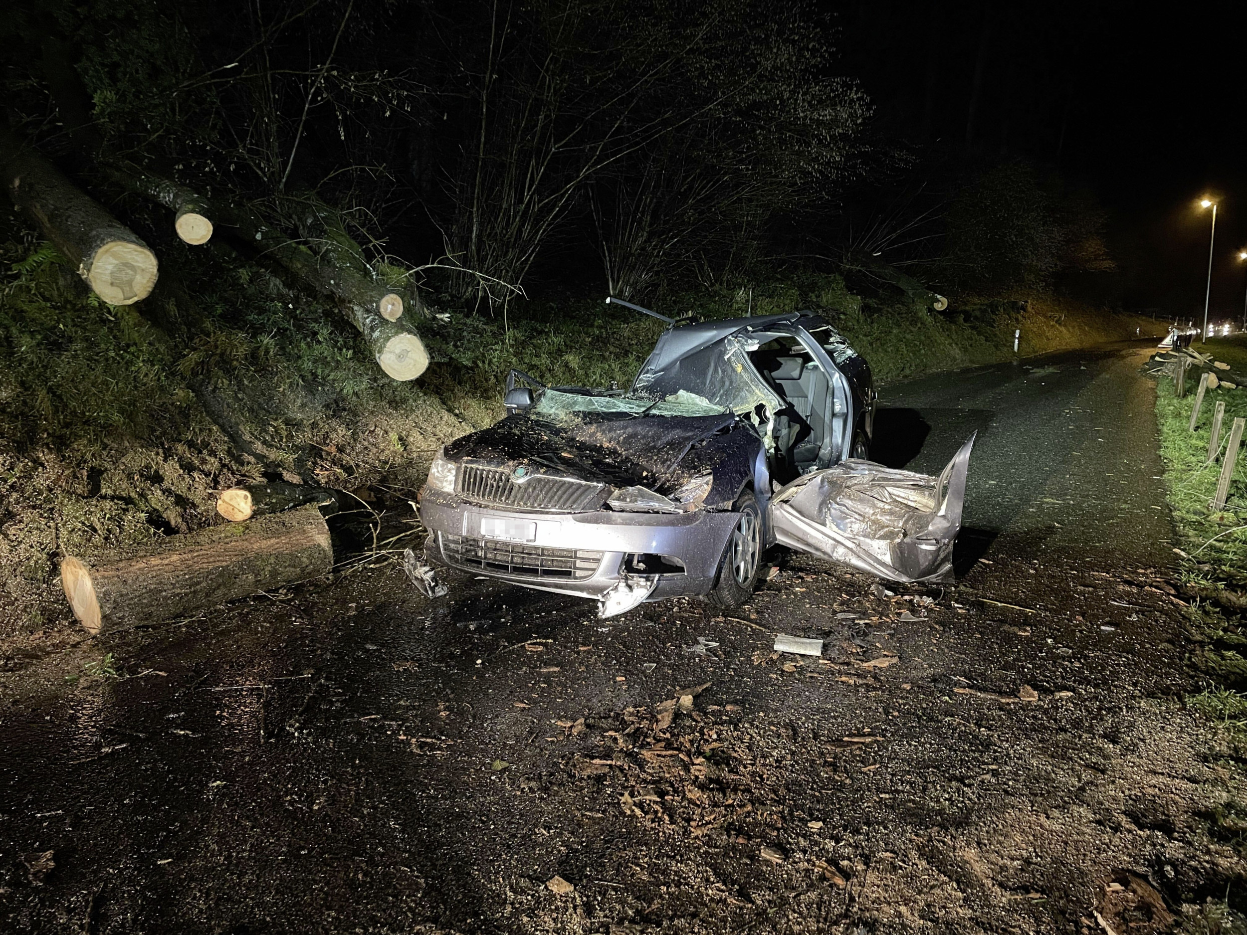 Er sei im Fahrzeug eingeklemmt worden und habe dabei erhebliche Verletzungen erlitten. Aus Sicherheitsgründen sei die betroffene Strasse bis am Samstagmorgen gesperrt worden, da noch weitere Bäume hätten gefällt werden müssen.