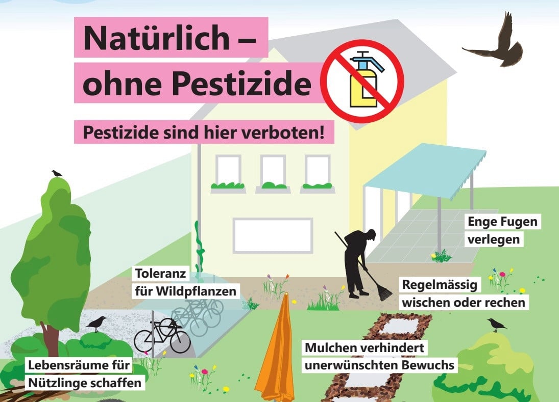 Um das Bewusstsein für diese Thematik zu stärken und pestizidfreie Alternativen aufzuzeigen, lanciert der Kanton die Kampagne «Natürlich – ohne Pestizide!». Die Kampagne richtet sich an Hauseigentümerinnen und -eigentümer sowie private Gärtnerinnen und Gärtner.