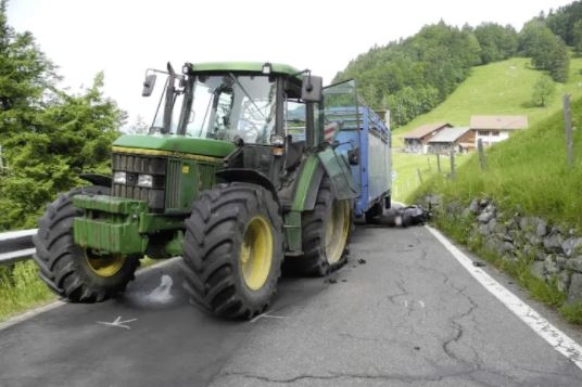 In Rickenbach im Kanton Schwyz kollidierte ein Motorrad mit einem stillstehenden Traktor.