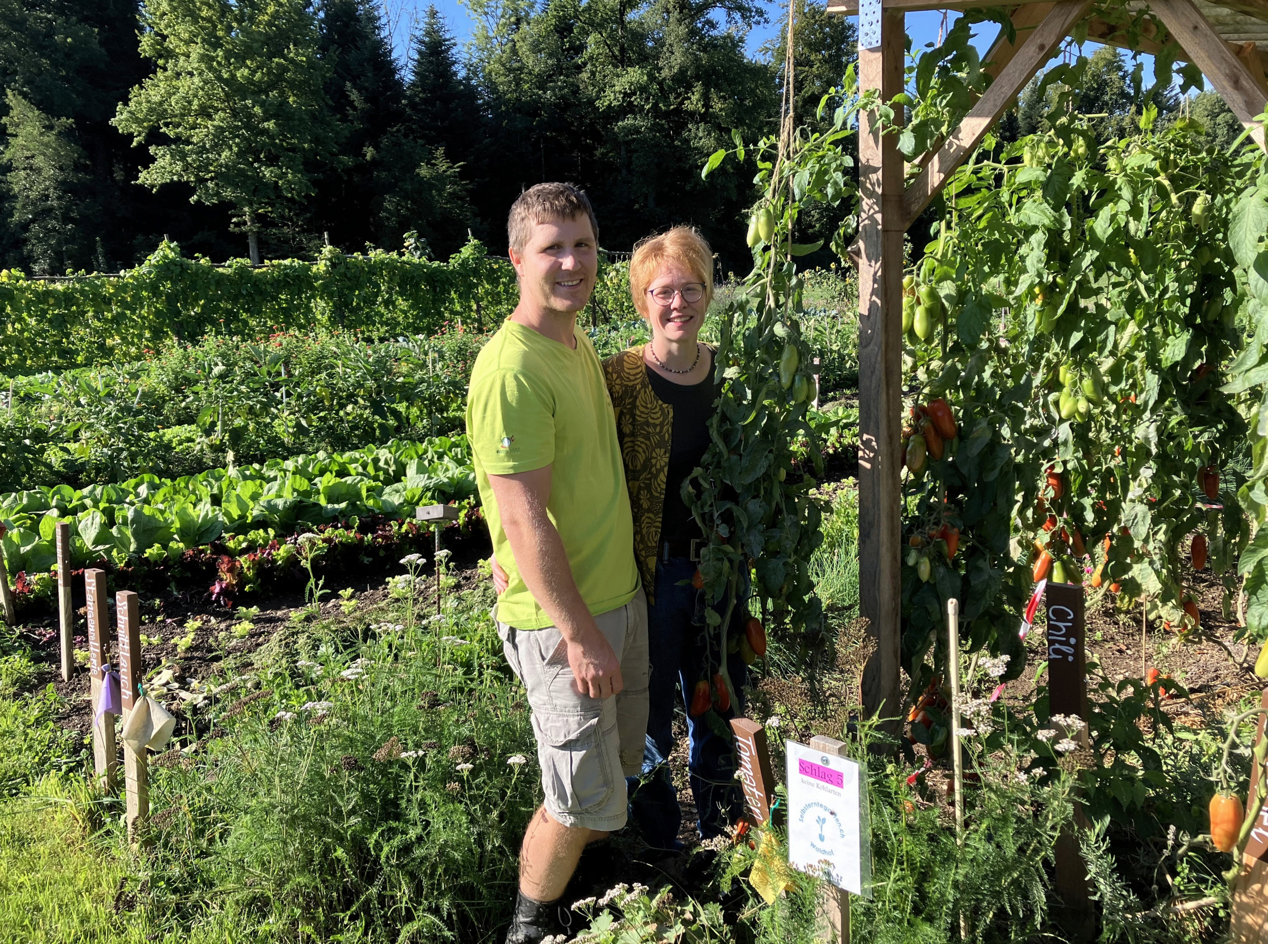 Vera und Marco Imfeld im Selbsterntegarten, wo Gemüse und Kräuter spriessen und gedeihen.