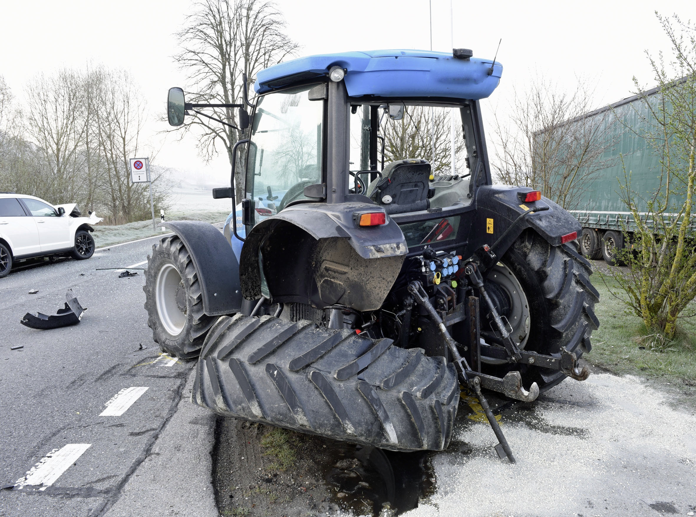 Aus noch unbekannten Gründen kam es bei Ziegelmoos zu einer massiven Auffahrkollision. Beim Zusammenprall wurde das linke Hinterrad des Traktors abgeknickt. Der Motorraum des Autos wurde zusammengedrückt.