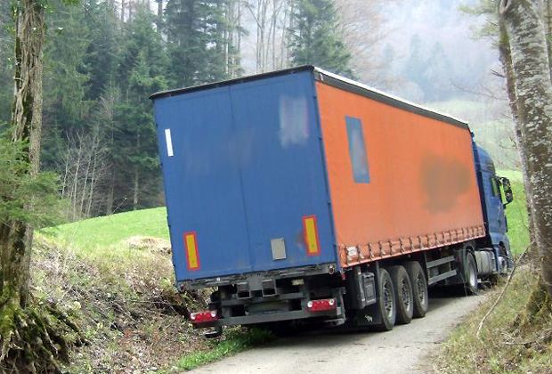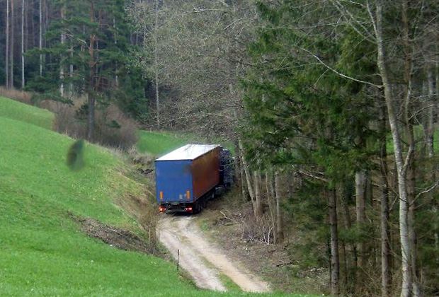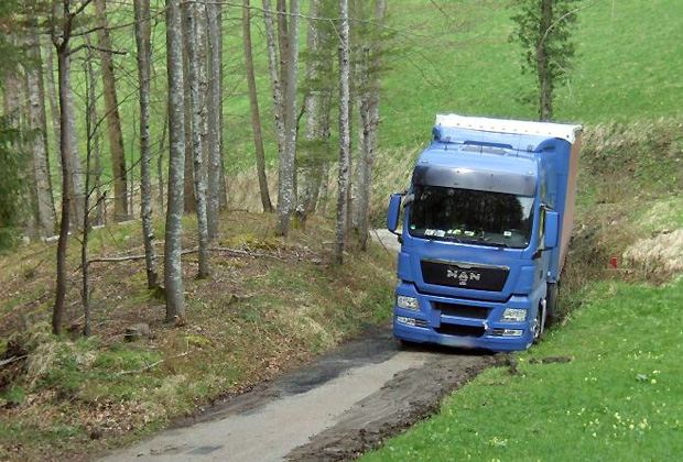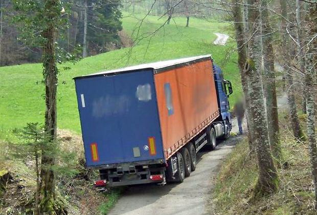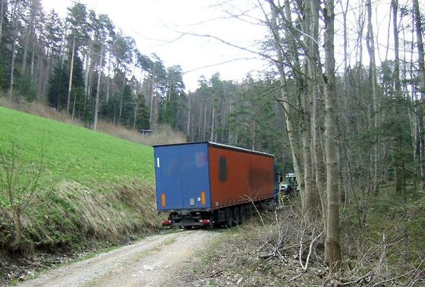 Da leistete einem deutschen Lastwagenschauffeur das Navigationsgerät einen Bärendienst. Er wollte Material auf eine Baustelle bringen. Er geriet aber auf schmale und steile Forstwege und versank im tiefem Boden. Ein Landwirt konnte dem Fahrer aus der Patsche helfen.