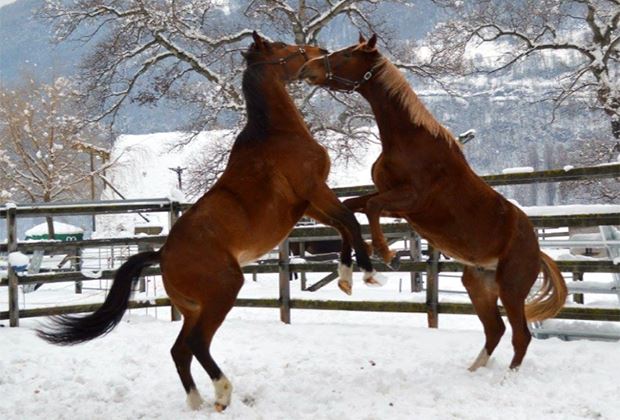 Die beiden Wallache vom Zucht-und Sportpferdestall Ilum im Wallis protzen mit ihren Kräften im Schnee.