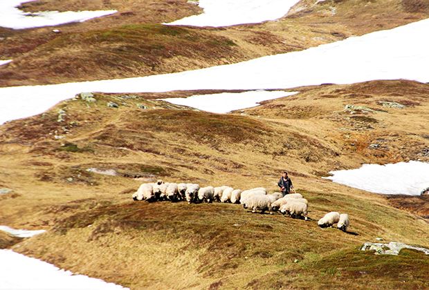 Schon bevor die letzten Schneefelder weggeschmolzen sind, ist der Hirte mit seiner Schafherde auf der Grimsel.