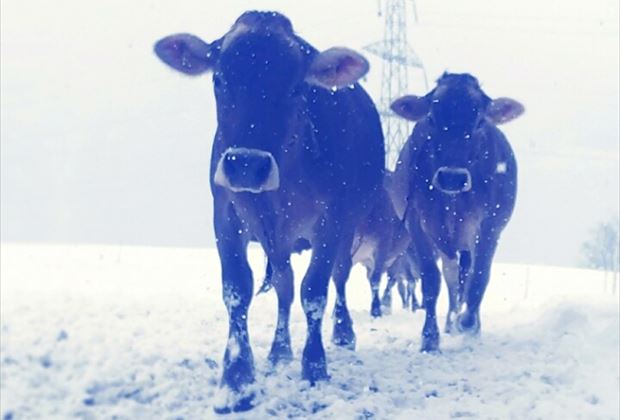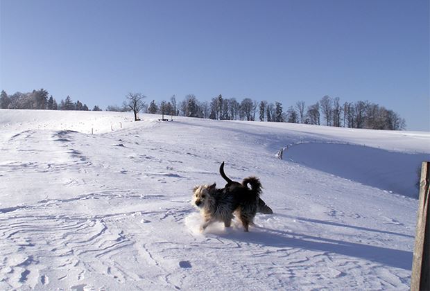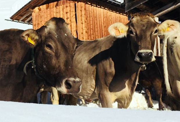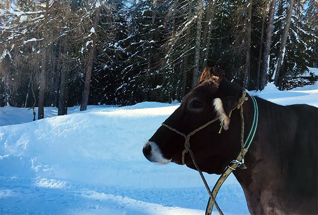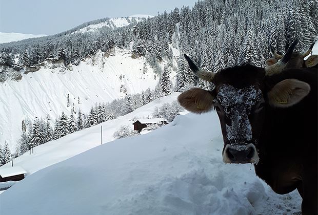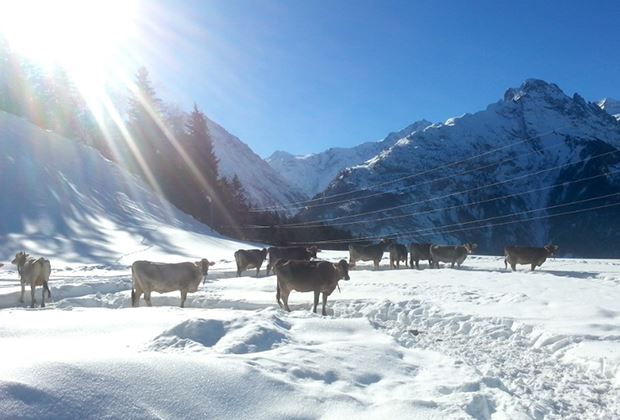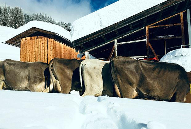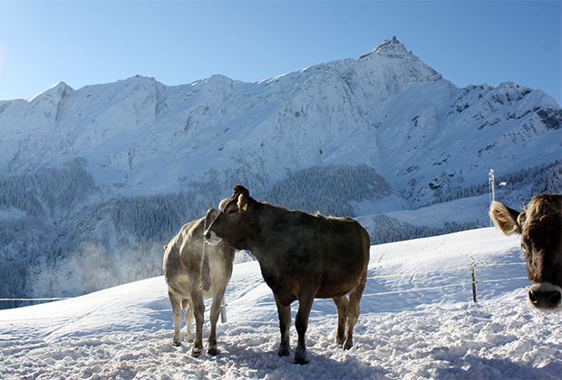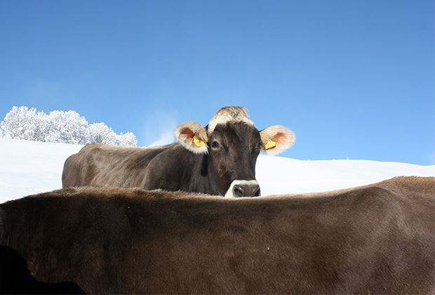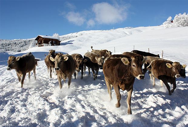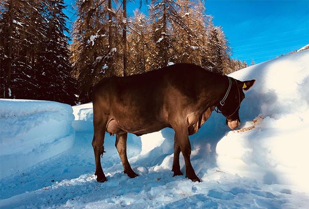 Die Rinder freuen sich riesig über den winterlichen, schön verschneiten Auslauf.