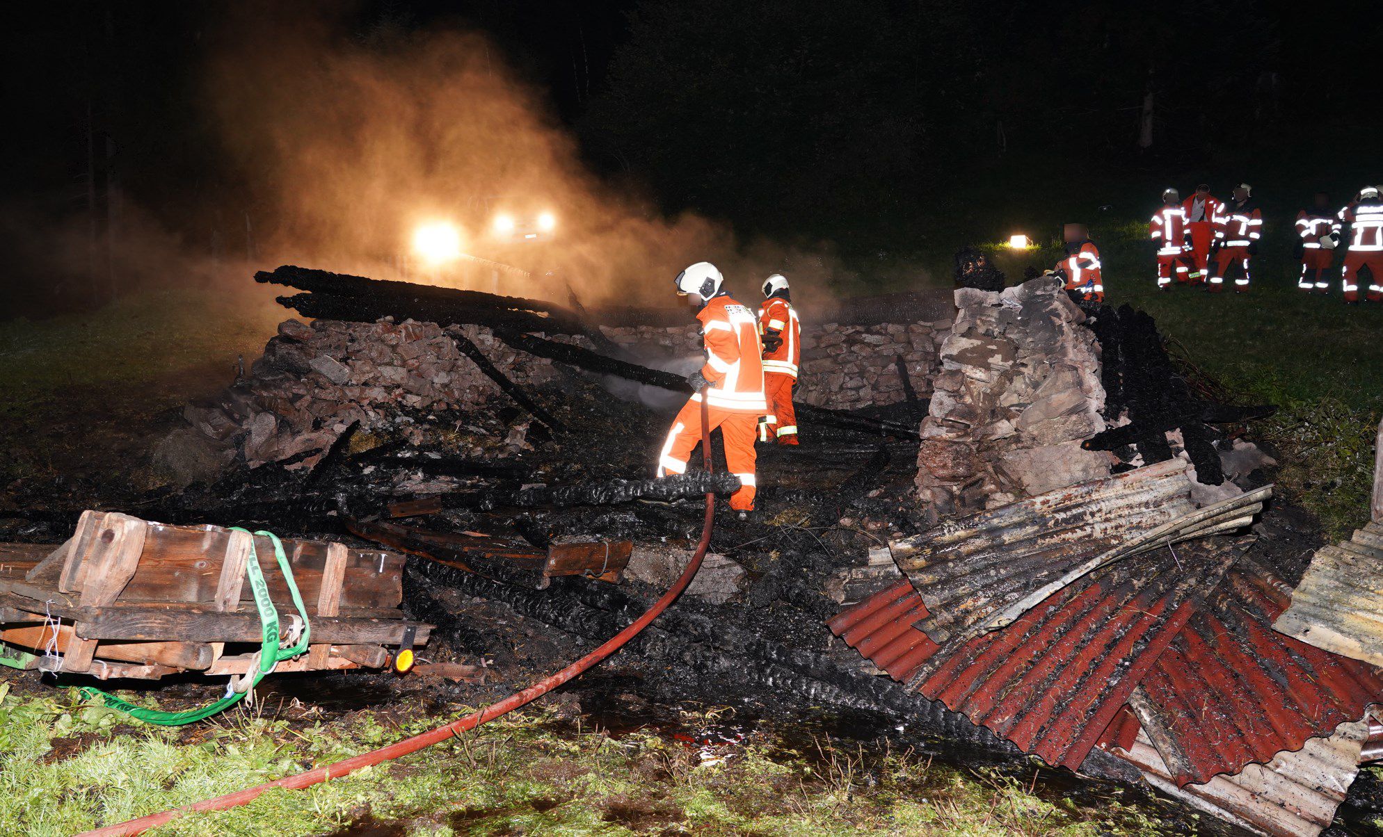 Als die Einsatzkräfte am Brandort eintrafen, stand das Gebäude bereits in Vollbrand. Es war nicht mehr zu retten. Der Stall wurde durch die Flammen zerstört. Bei Brandausbruch befanden sich keine Tiere im Gebäude. Menschen kamen nicht zu Schaden.