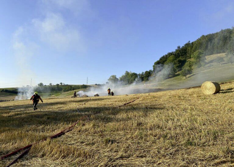Ein Landwirt war am Freitagabend damit beschäftigt, das auf dem Feld liegende Stroh zu Ballen zu pressen. Dabei geriet ein Strohballen in Brand. Das Feuer griff sofort auf das Stoppelfeld über.