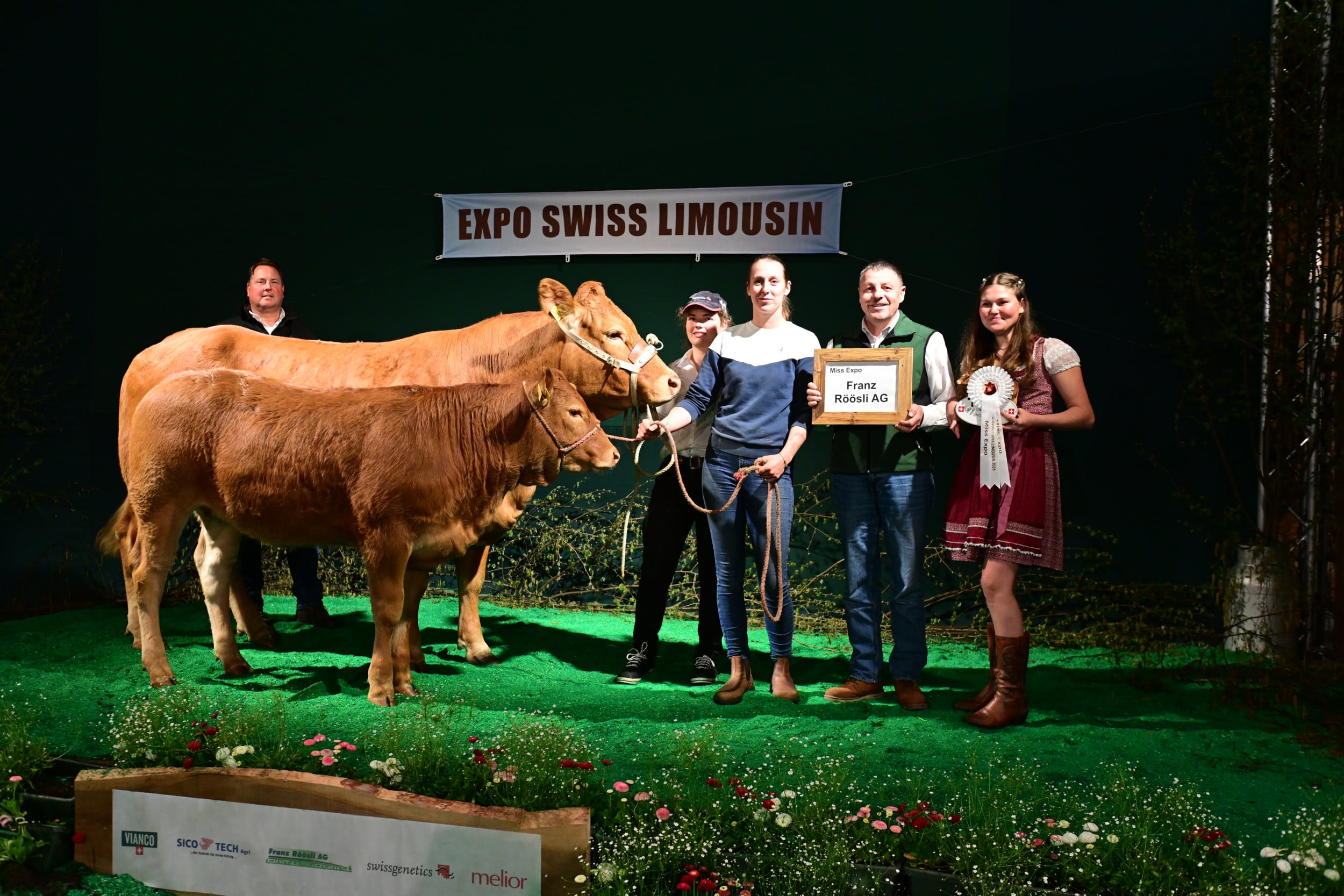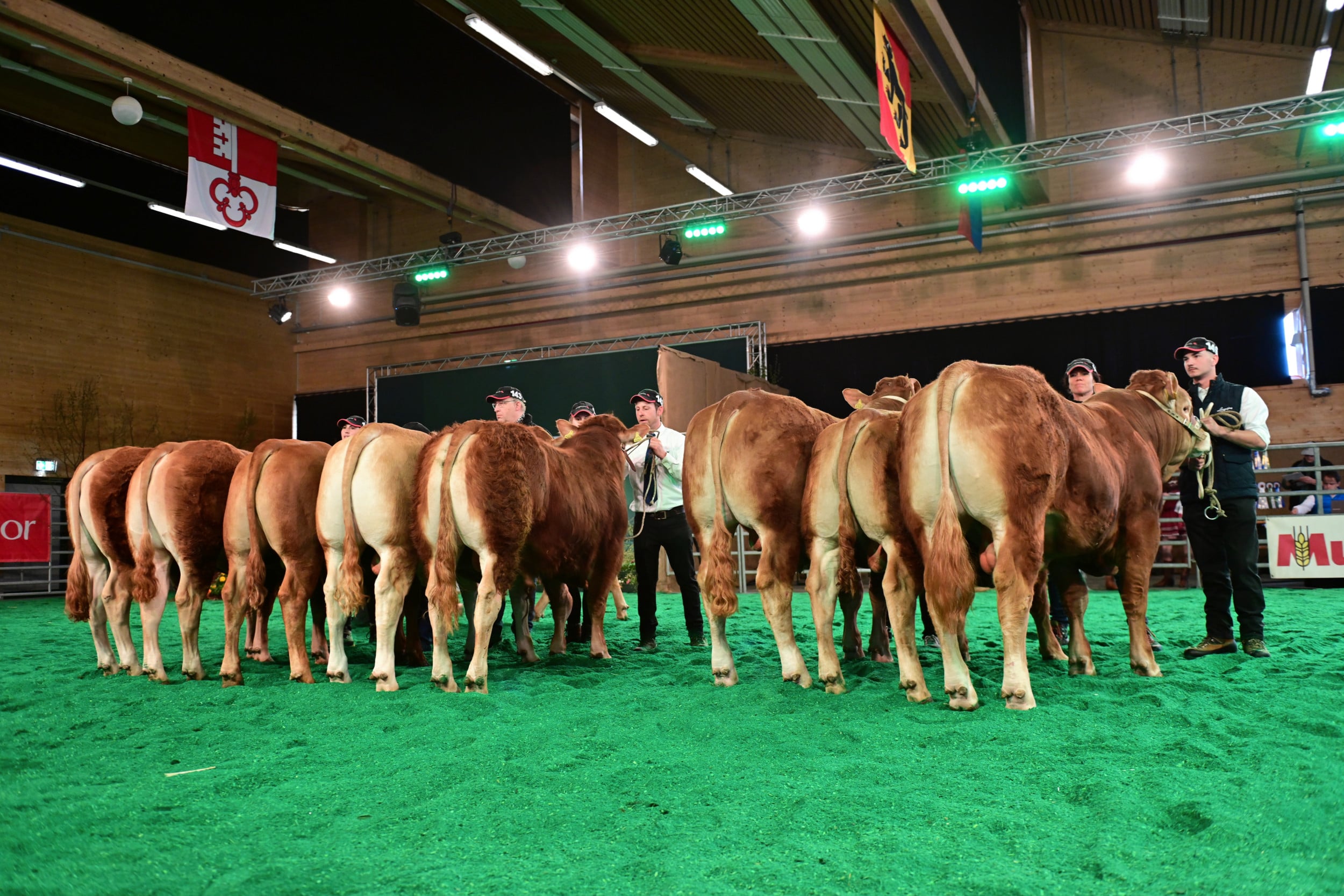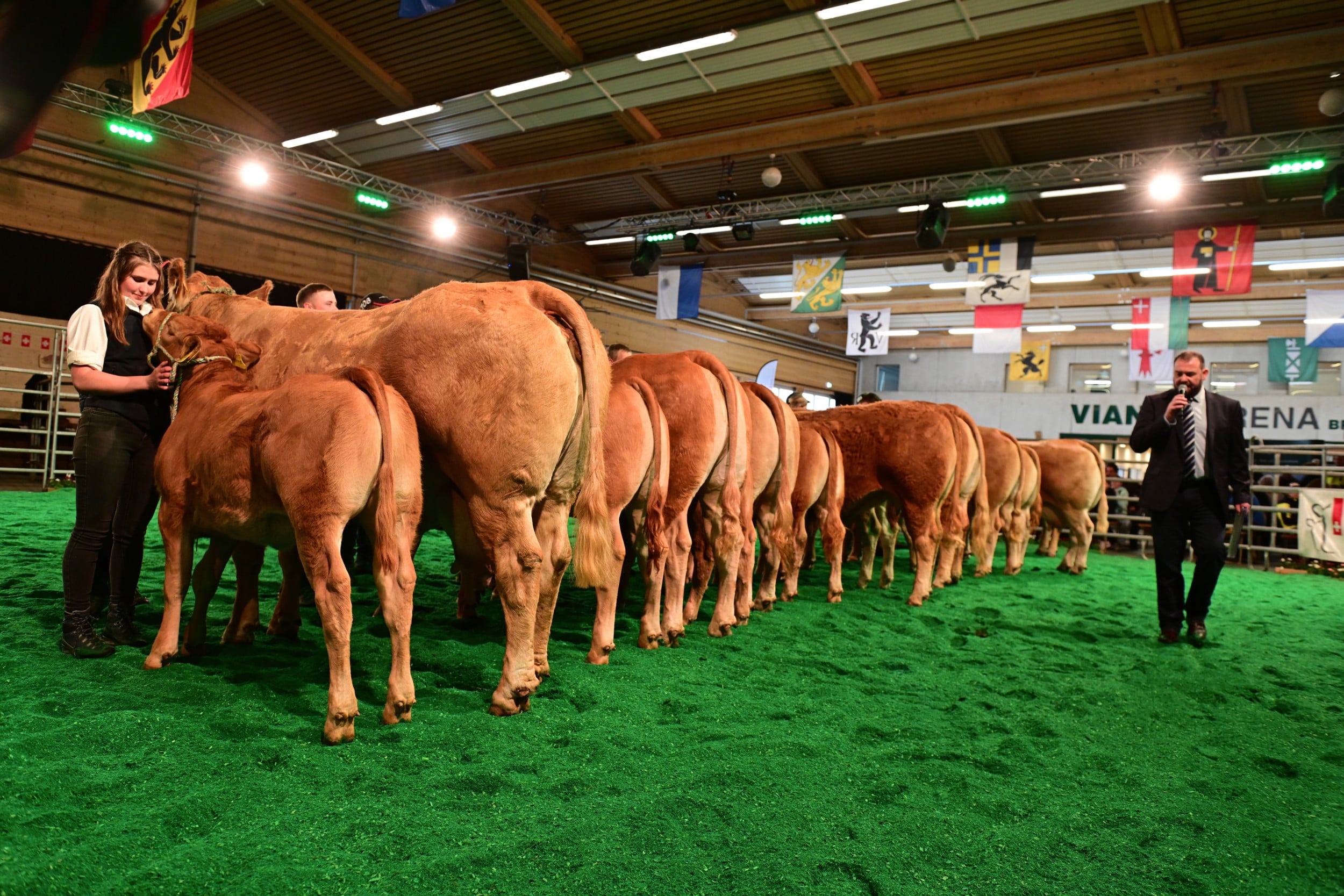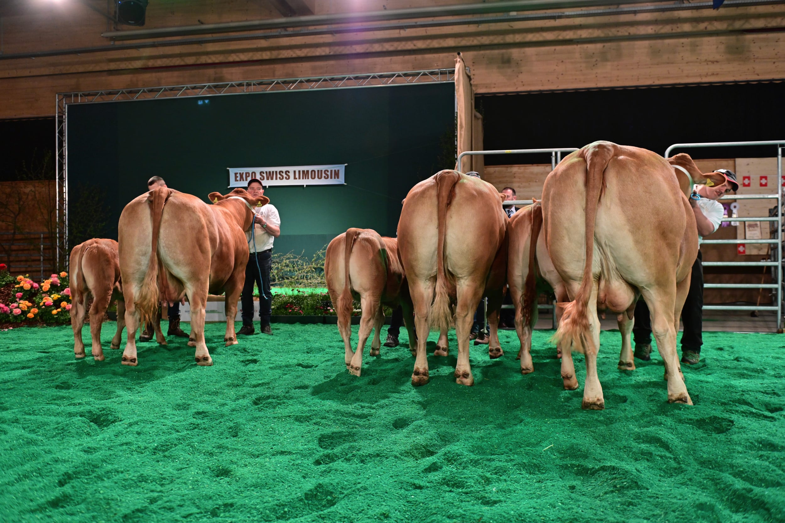 Für die Miss Expo stellten sich 24 Rinder und Kühe mit ihren Kälbern im Ring auf (die Kategorienersten und -zweiten). Zur Siegerin wurde erkoren Minders Rafaëla von der Ferme du Bey Sàrl, Elevage Minder aus Avenches VD. Sie sei schon am Morgen «ein coup de coeur» gewesen, ihm sofort ins Herz gegangen. «Ein wunderbares Tier mit einem top Rahmen, mit viel Breite, mit viel Beckenöffnung, guter Bemuskelung und vor allem noch mit einem Kalb, das seiner Mutter ähnlich sieht und Zukunft verspricht». Auf dem zweiten Rang landete Jele, die während der Ausstellung schon mehrere Entscheidungen gewonnen hat. Sie wurde gezüchtet von Franz-Xaver Nussbaum und ist im Besitz von Stefan Staub, Finstersee ZG. Zu ihr hiess es seitens Vincent Dumont: «Eine eindrückliche Kuh, nicht mit dem grössten Format, aber mit viel Muskeln, schönem Euter, in allem eine Riesenfreude.» Zur drittklassierten Kuh wurde Burri’s Colett von Burri’s Limousin, Dagmersellen LU, bestimmt, «eine starke Kuh mit guter Bemuskelung auf feinen Beinen».