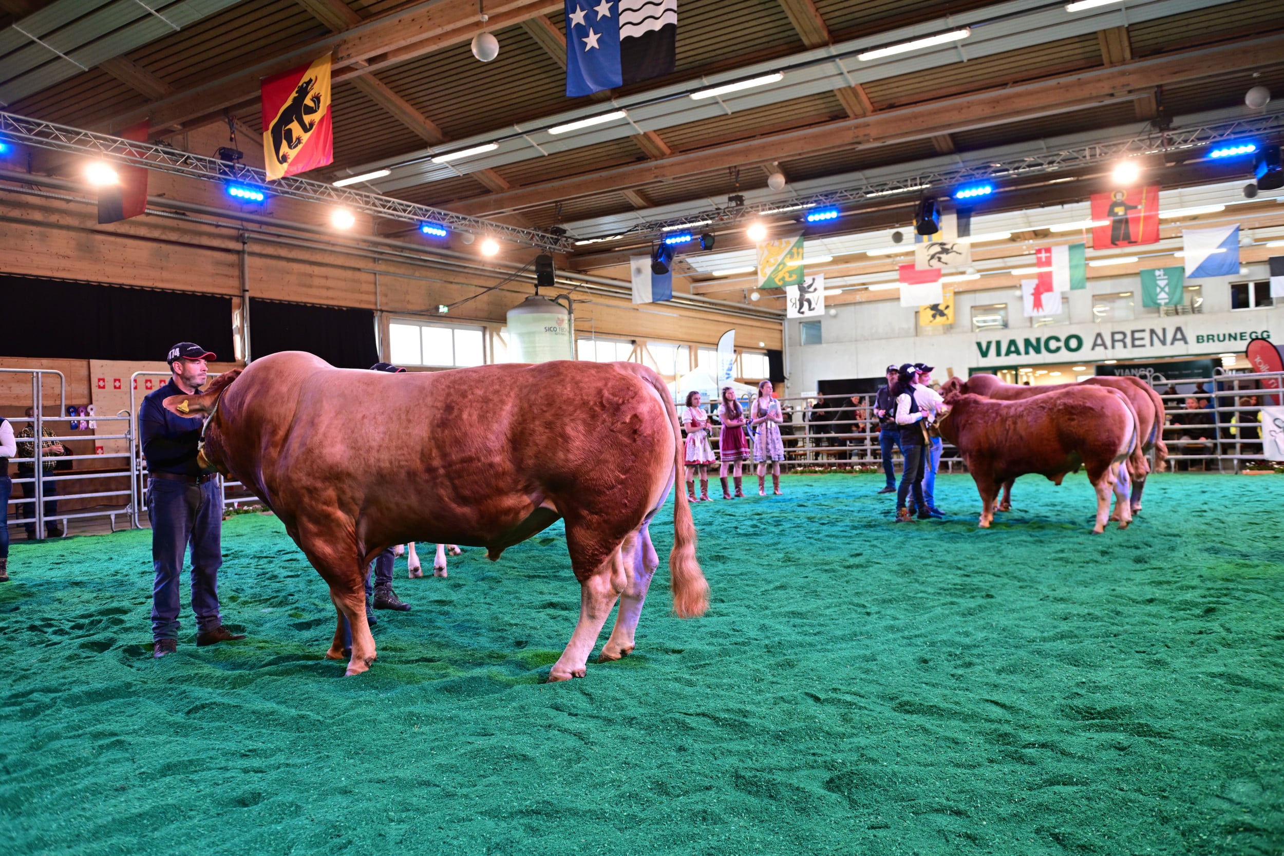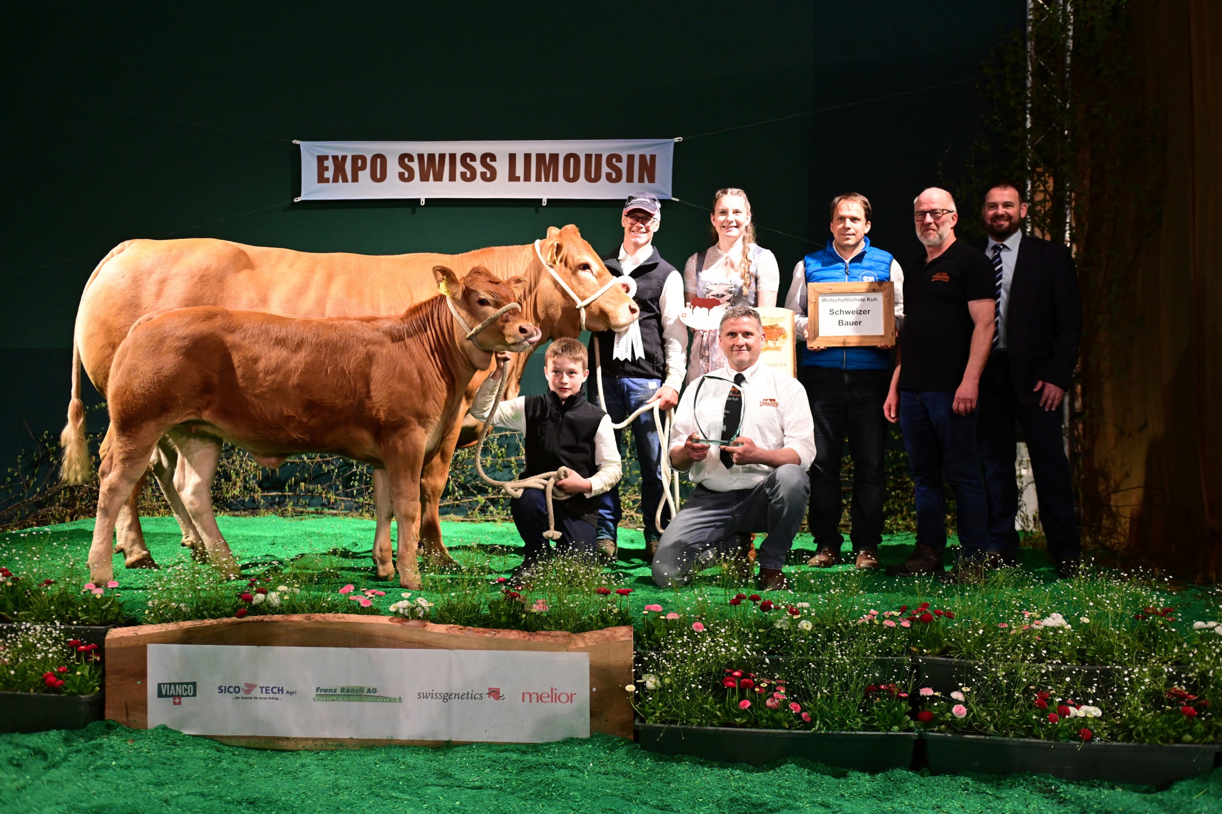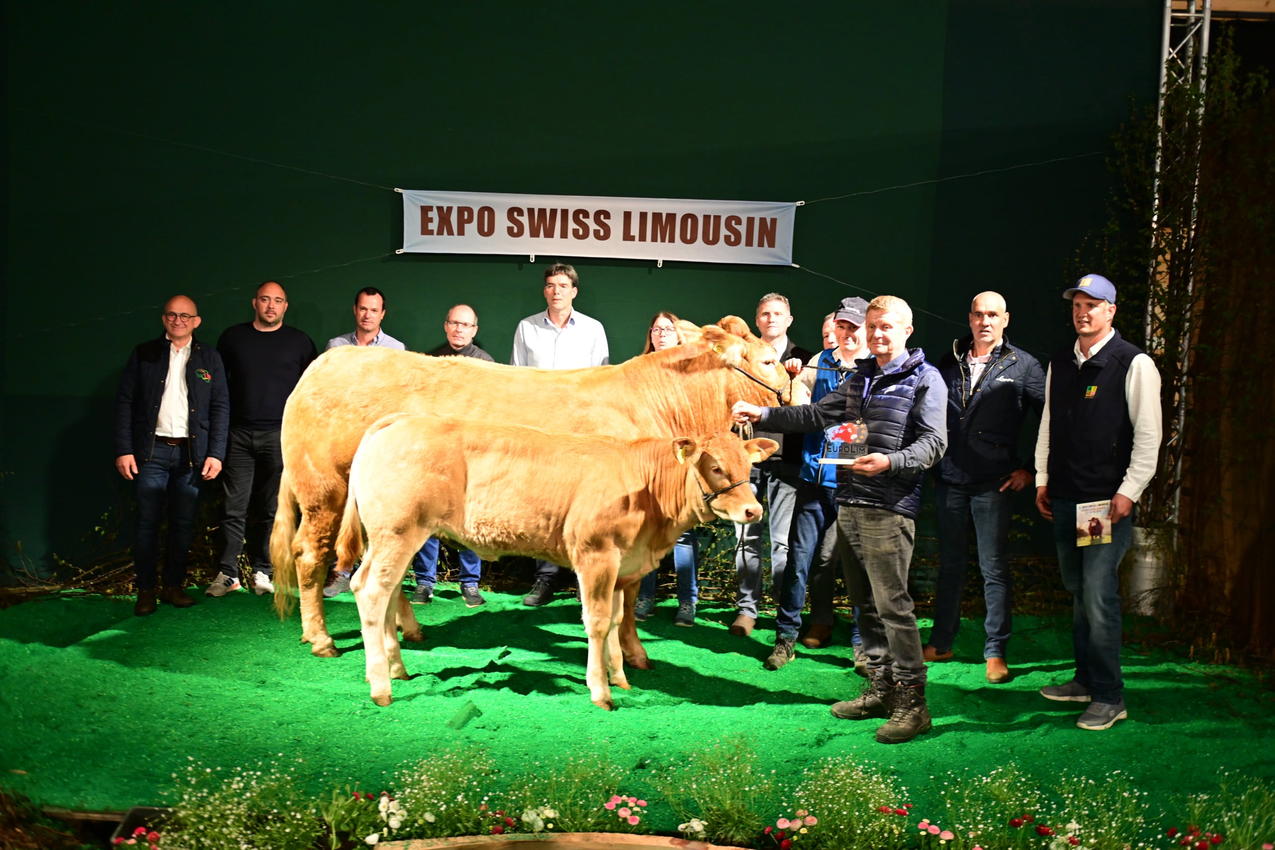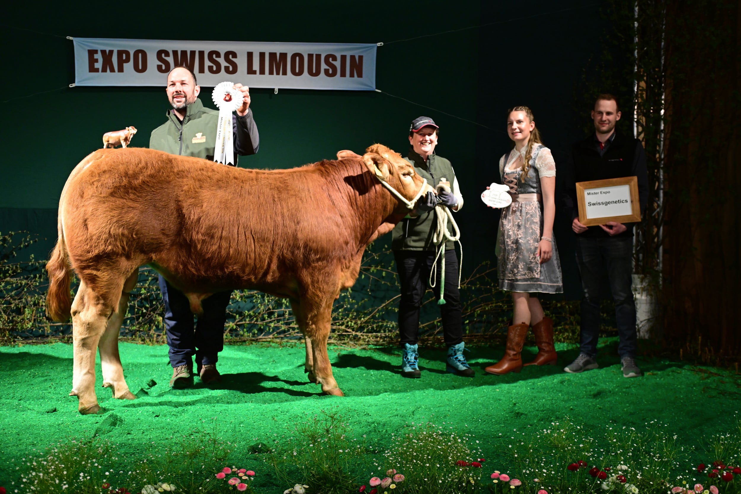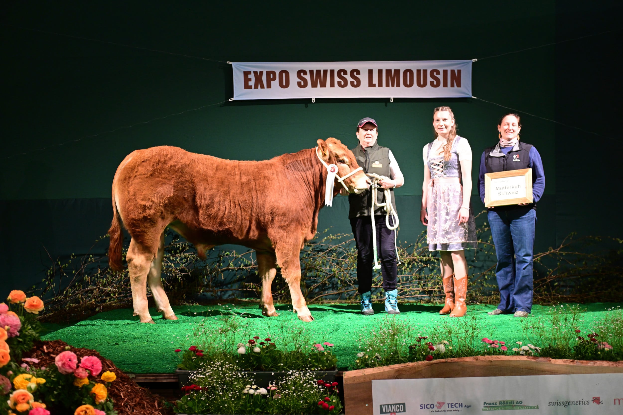 Für die Miss Expo stellten sich 24 Rinder und Kühe mit ihren Kälbern im Ring auf (die Kategorienersten und -zweiten). Zur Siegerin wurde erkoren Minders Rafaëla von der Ferme du Bey Sàrl, Elevage Minder aus Avenches VD. Sie sei schon am Morgen «ein coup de coeur» gewesen, ihm sofort ins Herz gegangen. «Ein wunderbares Tier mit einem top Rahmen, mit viel Breite, mit viel Beckenöffnung, guter Bemuskelung und vor allem noch mit einem Kalb, das seiner Mutter ähnlich sieht und Zukunft verspricht». Auf dem zweiten Rang landete Jele, die während der Ausstellung schon mehrere Entscheidungen gewonnen hat. Sie wurde gezüchtet von Franz-Xaver Nussbaum und ist im Besitz von Stefan Staub, Finstersee ZG. Zu ihr hiess es seitens Vincent Dumont: «Eine eindrückliche Kuh, nicht mit dem grössten Format, aber mit viel Muskeln, schönem Euter, in allem eine Riesenfreude.» Zur drittklassierten Kuh wurde Burri’s Colett von Burri’s Limousin, Dagmersellen LU, bestimmt, «eine starke Kuh mit guter Bemuskelung auf feinen Beinen».
