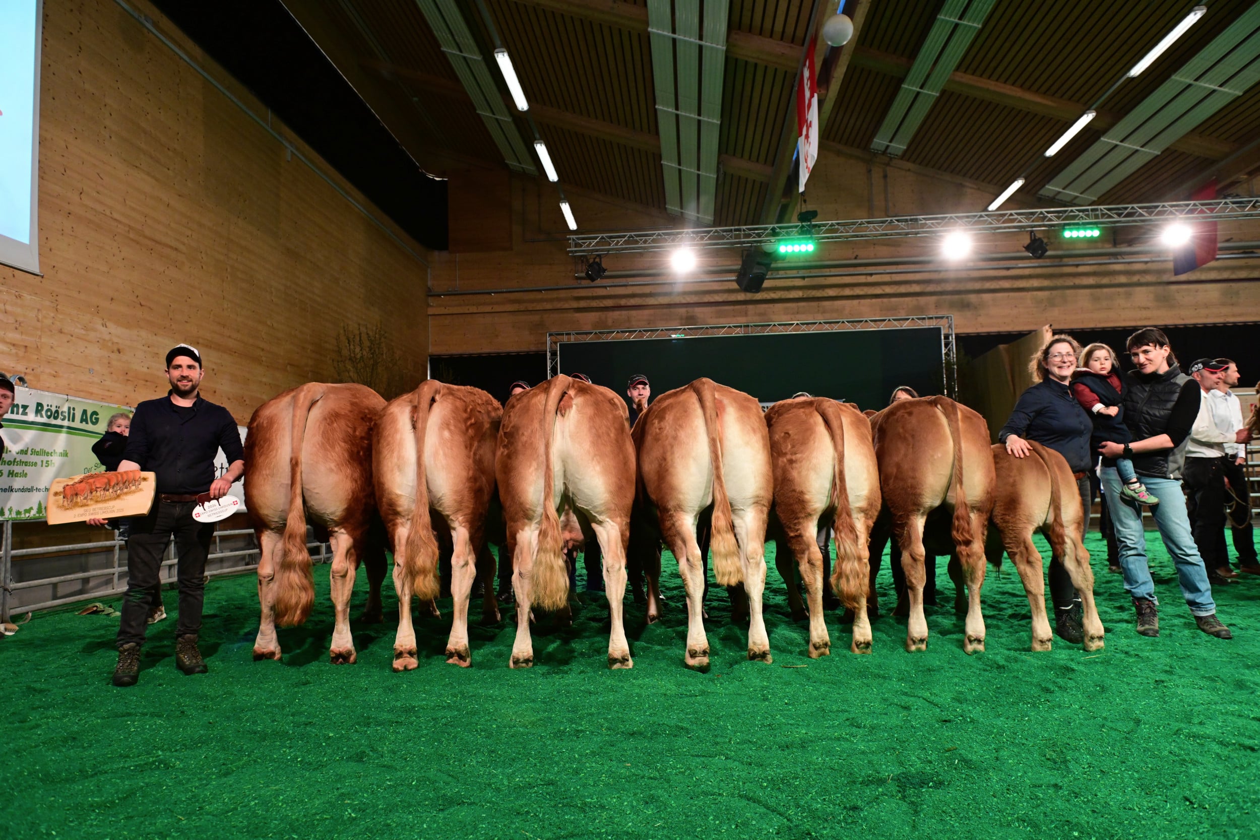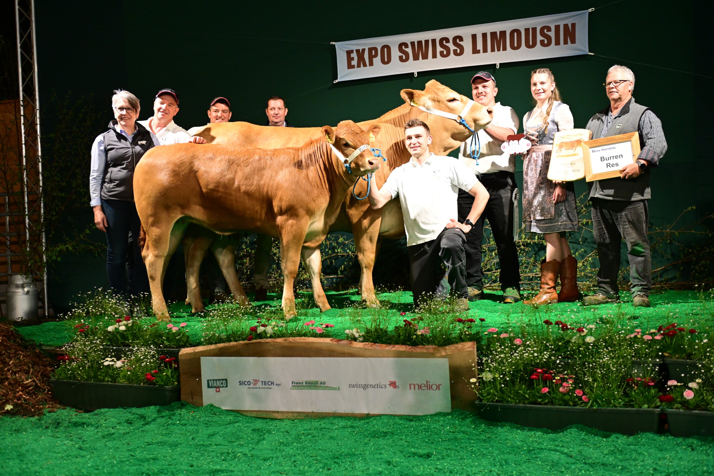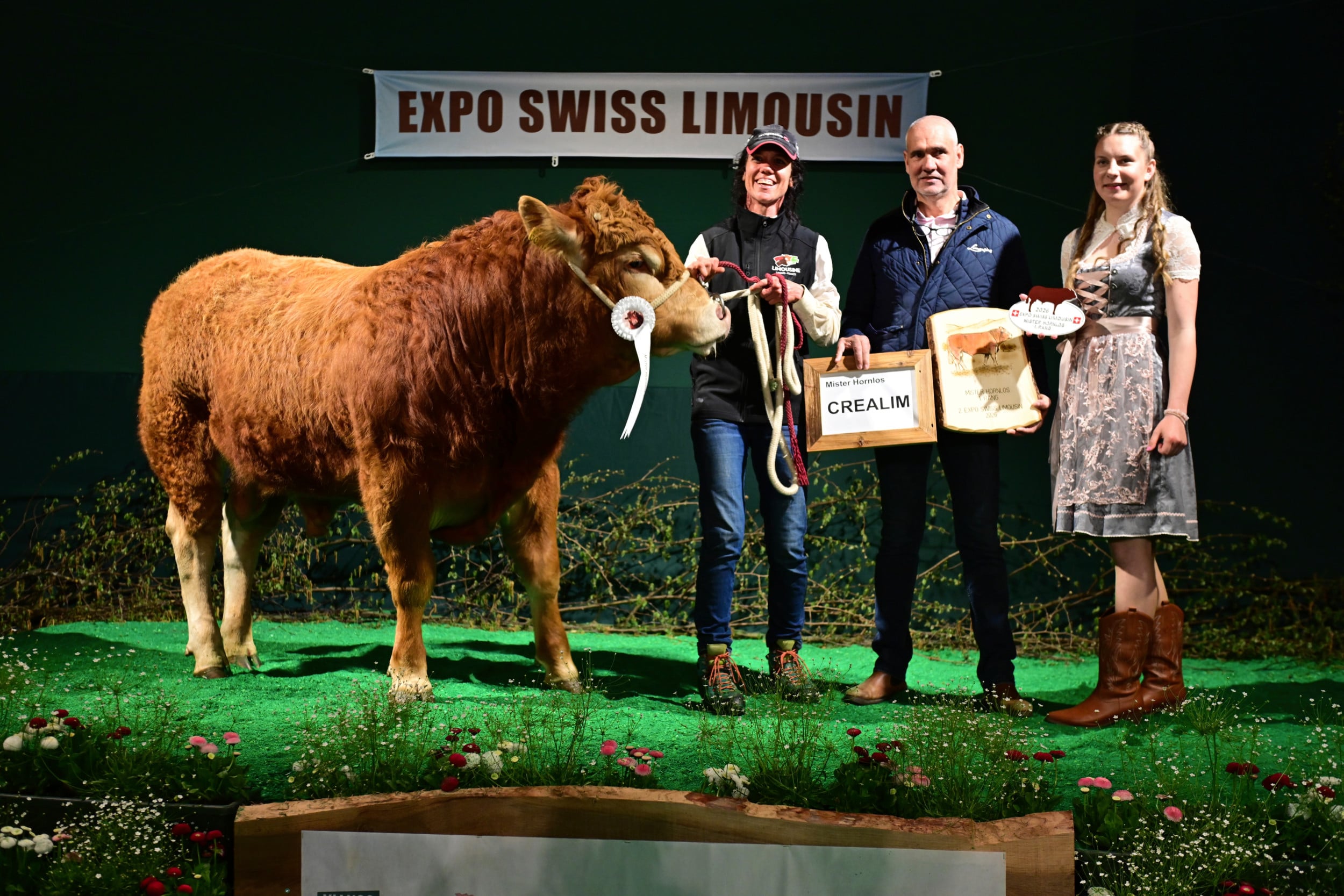 In der Kategorie Miss Hornlos wurde der Preis gesponsert von Res Burren, einem Pionier in der Schweizer Zucht auf Hornlosigkeit. Diese könnte gemäss Moderator Jakob Fritz wichtig werden, wenn man einmal nicht mehr enthornen dürfte. Richter Vincent Dumont zeigte sich beeindruckt ob der Qualität der Schweizer Hornloszucht. Im Rang standen über ein Dutzend Rinder und Kühe mit ihren Kälbern. Zur Siegerin bestimmte er Burri’s Colett von Burri’s Limousin, Dagmersellen LU. «Eine hervorragende Kuh mit vielen Vorzügen: Keule, Feinheit, Bewegungsablauf, ein Tier, das viel Sonntag hat», so der Kommentar. Auch die zweitplatzierte, der Absetzer Galliker’s Keira von Fabian Galliker, Gunzwil LU, habe keine sichtbaren Fehler, aber sie als Rind sei einfacher schön zu machen als die schon etwas reifere Siegerkuh. Auf den dritten Rang stellte Dumont die Kuh Obermoos Bavaria, gezüchtet und im Besitz von Beatrice und Stefan Bütler-Amhof, Hämikon LU. Eine sehr mächtige Kuh, die im Vergleich zu ihren Konkurrentinnen etwas weniger Eleganz und Feinheit aufweise, so Dumont.