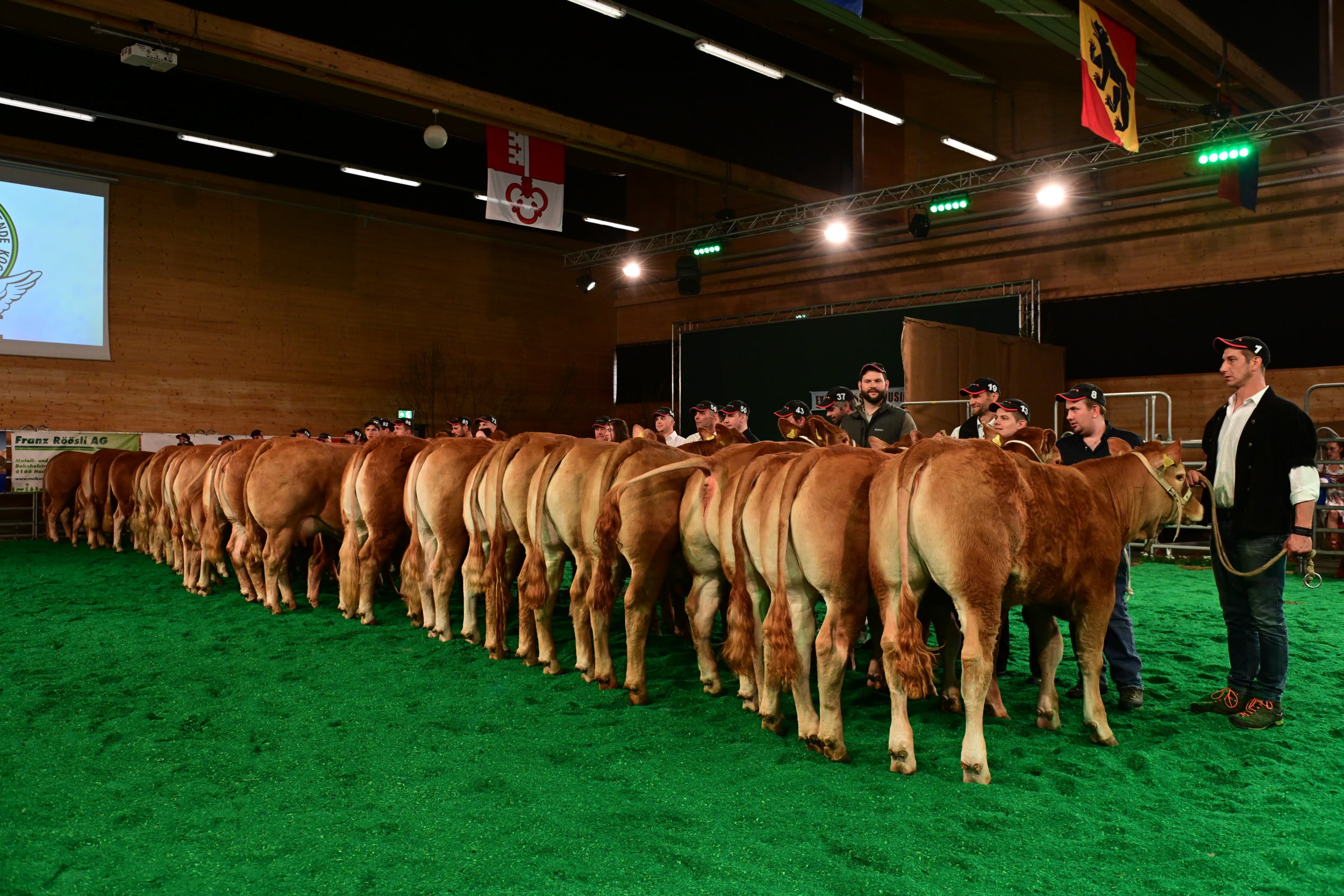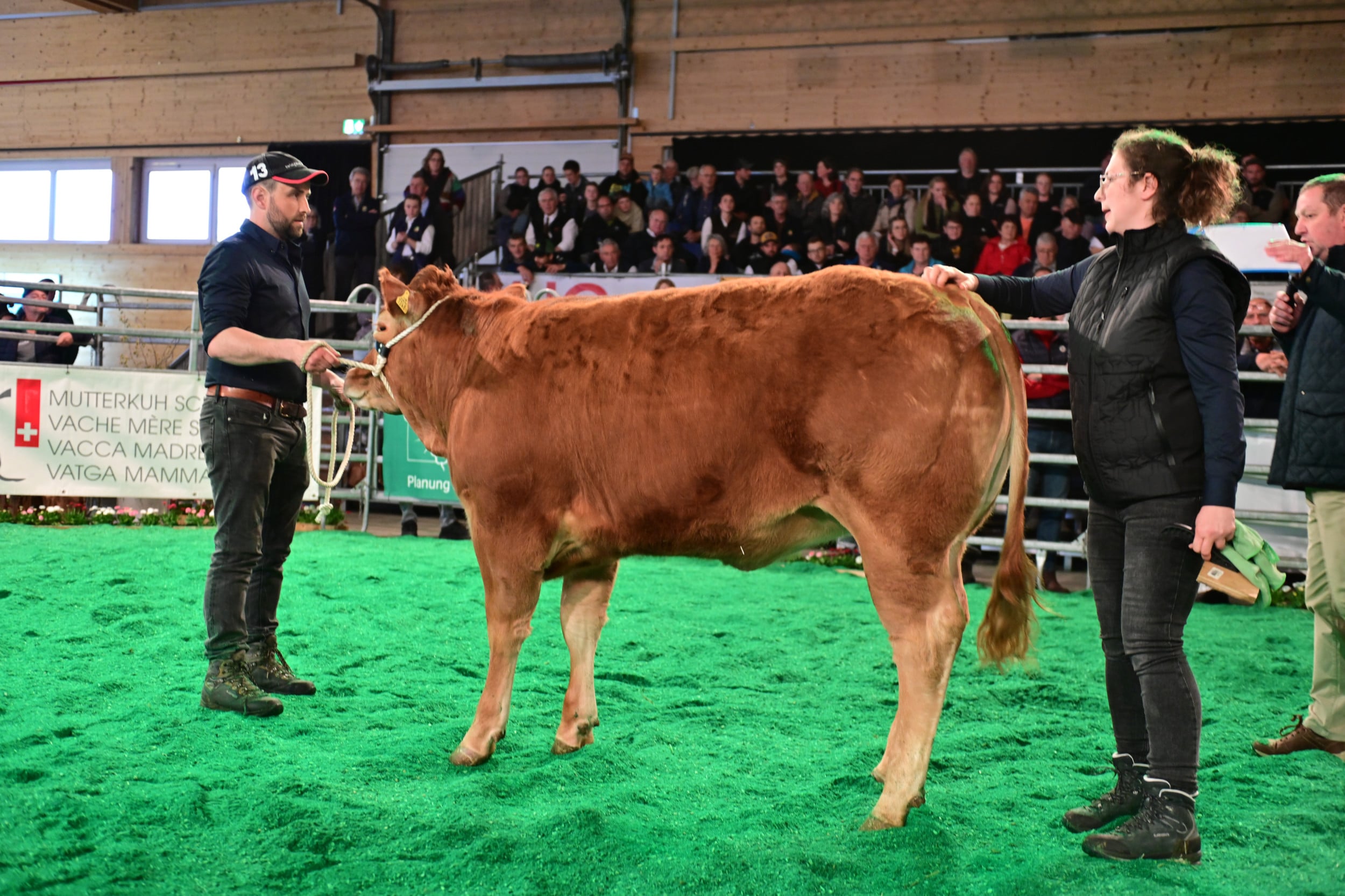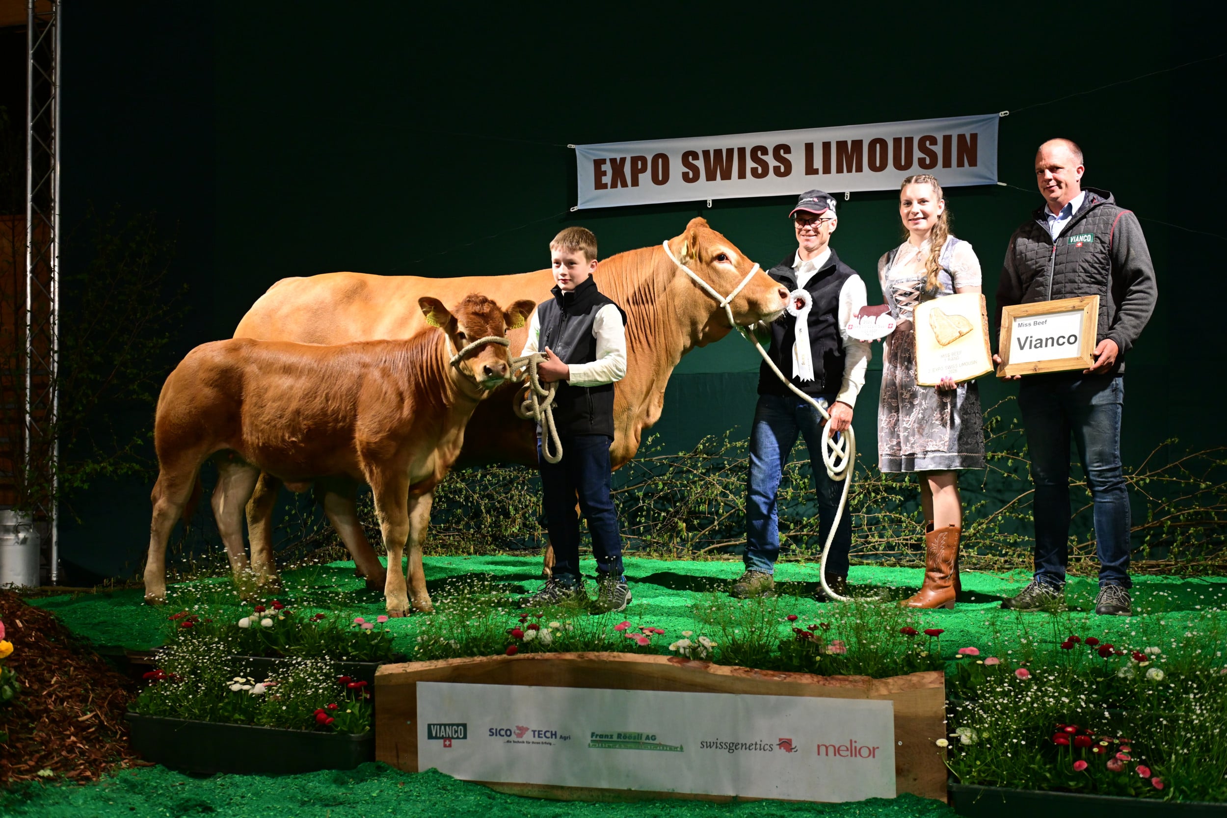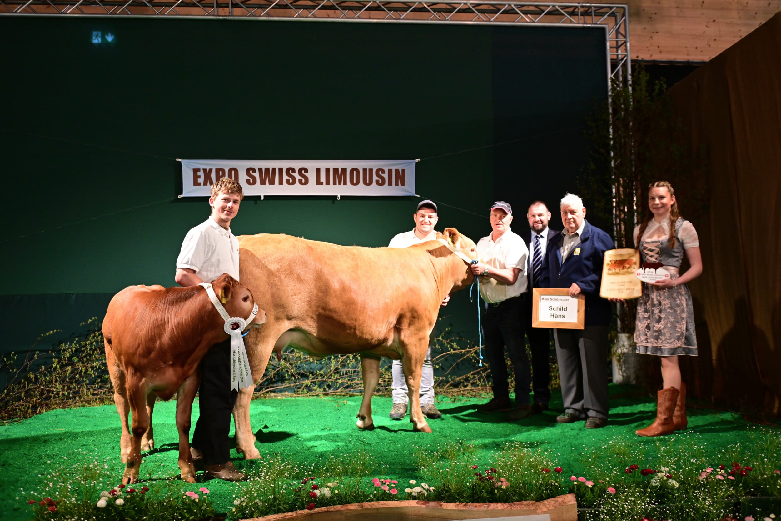 In der Kategorie Miss Hornlos wurde der Preis gesponsert von Res Burren, einem Pionier in der Schweizer Zucht auf Hornlosigkeit. Diese könnte gemäss Moderator Jakob Fritz wichtig werden, wenn man einmal nicht mehr enthornen dürfte. Richter Vincent Dumont zeigte sich beeindruckt ob der Qualität der Schweizer Hornloszucht. Im Rang standen über ein Dutzend Rinder und Kühe mit ihren Kälbern. Zur Siegerin bestimmte er Burri’s Colett von Burri’s Limousin, Dagmersellen LU. «Eine hervorragende Kuh mit vielen Vorzügen: Keule, Feinheit, Bewegungsablauf, ein Tier, das viel Sonntag hat», so der Kommentar. Auch die zweitplatzierte, der Absetzer Galliker’s Keira von Fabian Galliker, Gunzwil LU, habe keine sichtbaren Fehler, aber sie als Rind sei einfacher schön zu machen als die schon etwas reifere Siegerkuh. Auf den dritten Rang stellte Dumont die Kuh Obermoos Bavaria, gezüchtet und im Besitz von Beatrice und Stefan Bütler-Amhof, Hämikon LU. Eine sehr mächtige Kuh, die im Vergleich zu ihren Konkurrentinnen etwas weniger Eleganz und Feinheit aufweise, so Dumont.