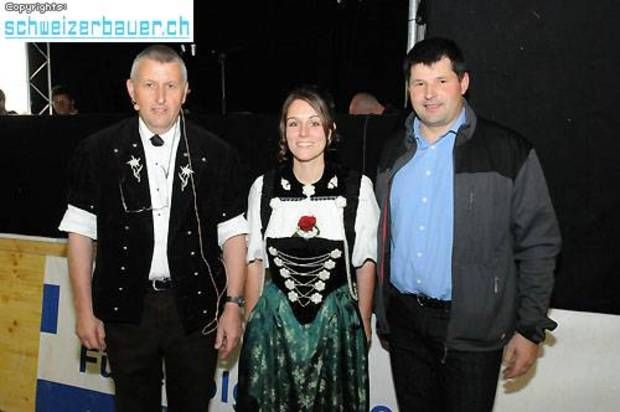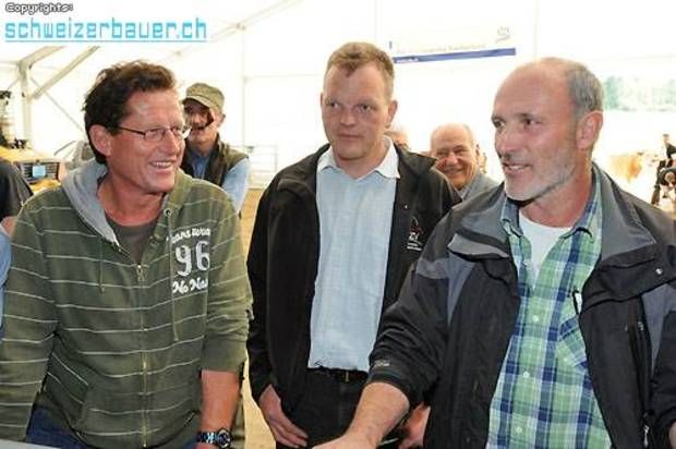 Niklaus Hofer, Präsident des Bernischen Fleckviehzuchtverbandes (l.) und der neue Lobag-Präsident Hansjörg Rüegsegger freuen sich mit Ehrendame Regula Hänni über die gelungene Eliteschau. -