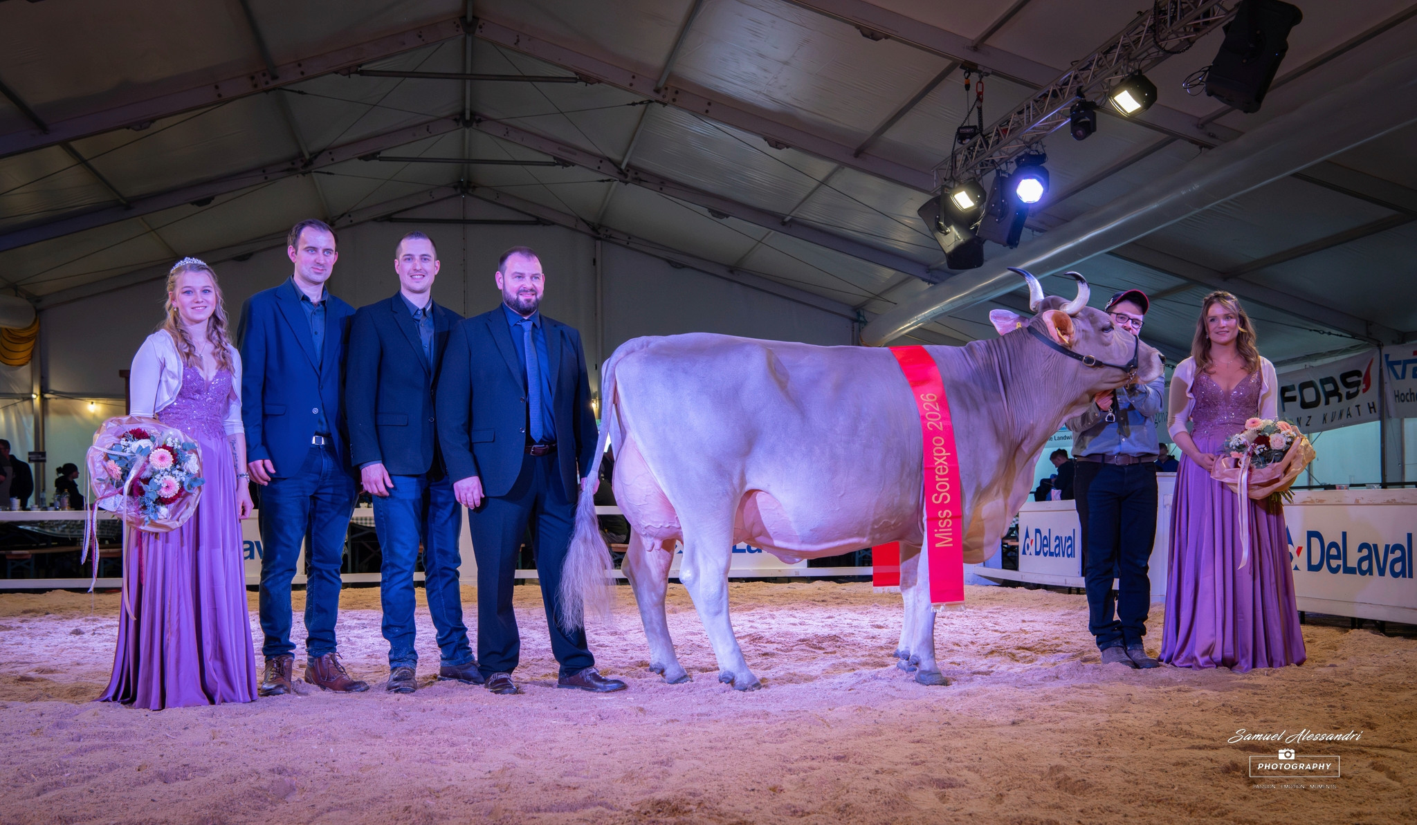 Nun ging es an die Wahl der Miss Sorexpo. Mit eindringlichen Worten wandte sich Richter Stefan Hodel noch einmal an das Publikum: «Schaut euch dieses Bild an, was hier in den letzten Jahren verbessert wurde – das ist nicht meine Arbeit, sondern eure Arbeit. Alles Gute weiterhin in Haus, Hof und Stall.» Für ihn zeichnete sich rasch ein klares Podest ab: «Die Kühe, die heute richtig auf den Punkt bereit sind, werden es heute auch mit nach Hause nehmen.» Besonders deutlich wurde Hodel bei seiner Siegerin: «Ich kann es nicht anders sagen, und das meine ich genau so: Diese Drittmelk ist wie geschnitzt.» Er lobte ihre enorme Stabilität und Mobilität sowie das «absolute Hammereuter» mit perfekter Verbindung, viel Breite, feiner Textur und vier funktionellen Zitzen – für ihn eine «absolute Traumkuh». Die Miss überzeugte zudem mit ausreichender Brusttiefe und Brustbreite und setzte sich damit vor die Vize-Miss mit einem ebenfalls aussergewöhnlichen Euter. Trotz ihrer starken Qualitäten musste diese Zweitmelk hinter der Siegerin knapp zurückstehen. In dieser Ausgabe setzte Tobias Krieg aus Eschenbach SG der Ausstellung seinen Stempel auf: Ihm gehörten sowohl die neue Miss Sorexpo Krieg’s Donald Wilma als auch die Drittplatzierte Krieg’s Dom Delia, welche bei den Mittleren auch die Schöneuterwahl dominierten. Den Titel der Vize-Miss holte sich Schacher’s Lordan Linda aus Escholzmatt LU.