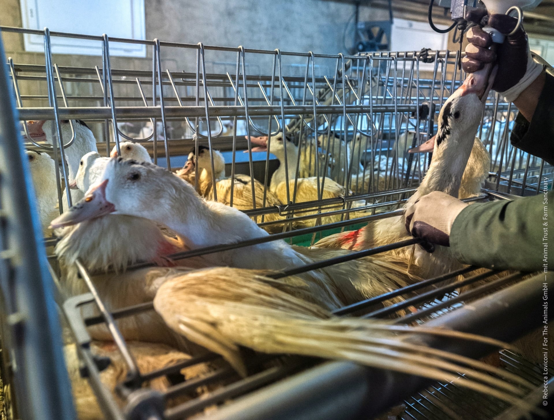 Für die Stopfleberproduktion werden Enten und Gänse in Käfigen gehalten, gezielt und zwanghaft überfüttert, damit sich die Leber bis zu zehnmal vergrössert.