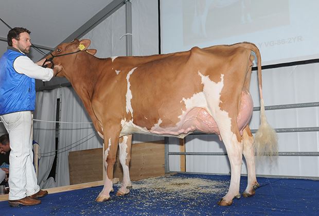 Das teuerste Brown-Swiss-Angebot war das für den GP von Sargans angemeldete Rind Felder’s BS Alino Ashley aus der Zucht von Franz Felder, Marbach. Die Tochter der erfolgreichen Schaukuh, Tschudenhaus Big Boy Polly, galt ebenfalls 11500 Franken. Die Ur-Enkelin von Apple, MS Aysha Attico Ancy aus MS Angelina Mr Savage Aysha galt 11000 Franken. Verkäufer war Bernhard Strobl, Luchsingen. Die Swiss Expo Kategoriensiegerin GS Alliance Destry Misty galt 9500 Franken. Die Kuh von S Bro Holsteins wurde zusammen mit zwei Embryonen von Redstream verkauft. Nohl Holsteins hatte mehrere heisse Eisen im Feuer. So auch Auch Blondin Absolute Nohl Salya. Die Tochter der Grand Champion von Toronto im 2014 wechselte für 9500 Franken ihren Besitzer. Schliesslich folgten viele weitere Angeboten mit hohen Preisen über 7000 Franken. Das teuerste Jersey-Angebot war Arethusa Showdown Vonn von Marcel Nussbaumer, Oberägeri, für 8000 Franken. Vonn ist keine geringere als die Vollschwester von Arethusa Response Vivid EX95. Vivid ist unter anderem die Supreme-Champion der Royal Winter Fair in Toronto 2014.