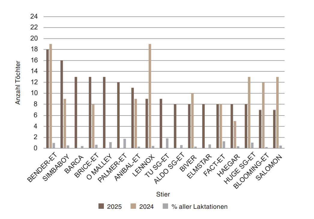 Wie bereits im Vorjahr führt der Stier Bender das Ranking der Vatertiere mit den meisten Economy-Star-Töchtern an; insgesamt 18 seiner Nachkommen wurden mit dem begehrten Abzeichen prämiert. Dahinter folgen die Töchter von Simbaboy mit 16 Auszeichnungen sowie jene von Barca, Brice-ET und O Malley mit jeweils 13. Palmer-ET ist mit zwölf Töchtern in der Bestenliste vertreten.