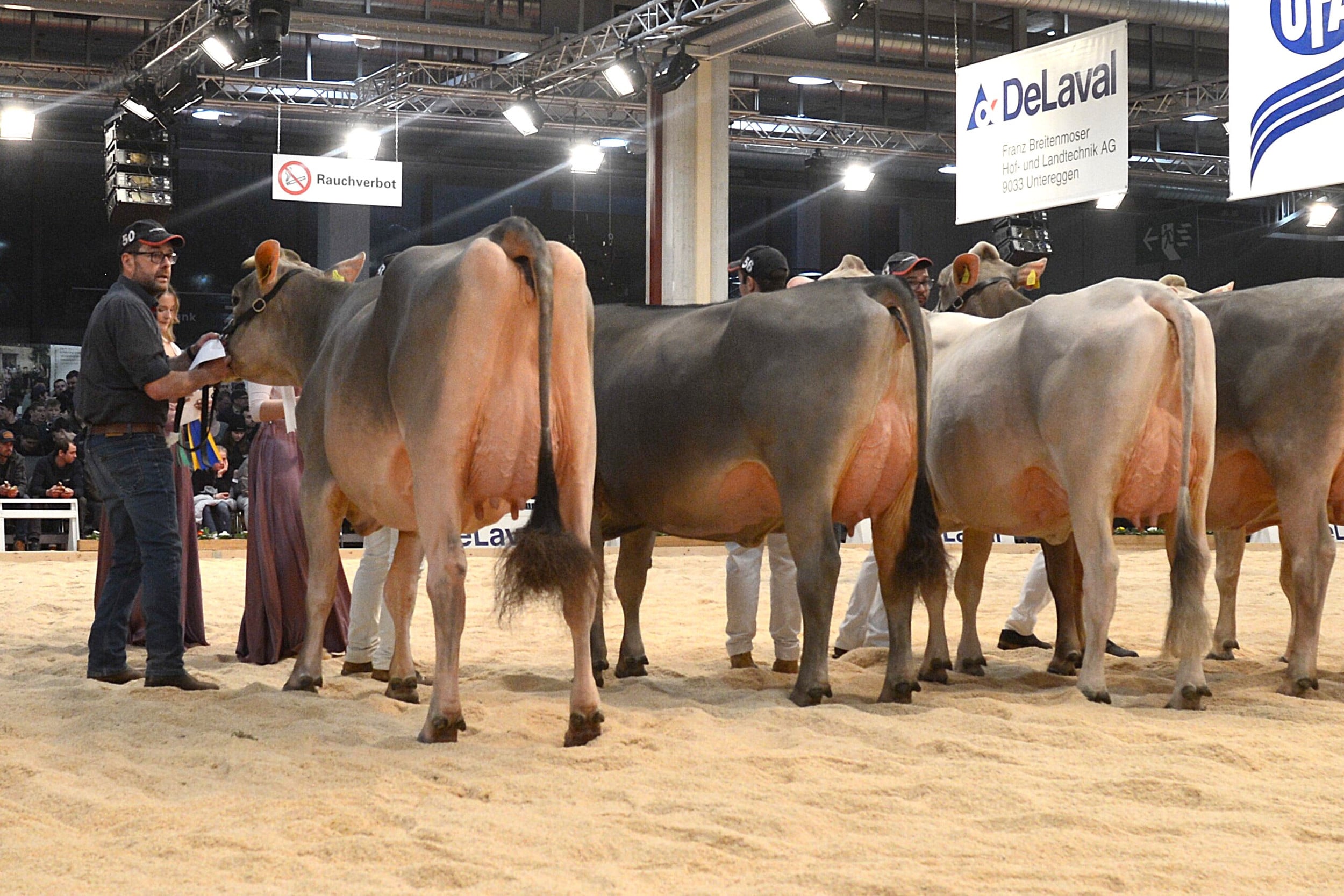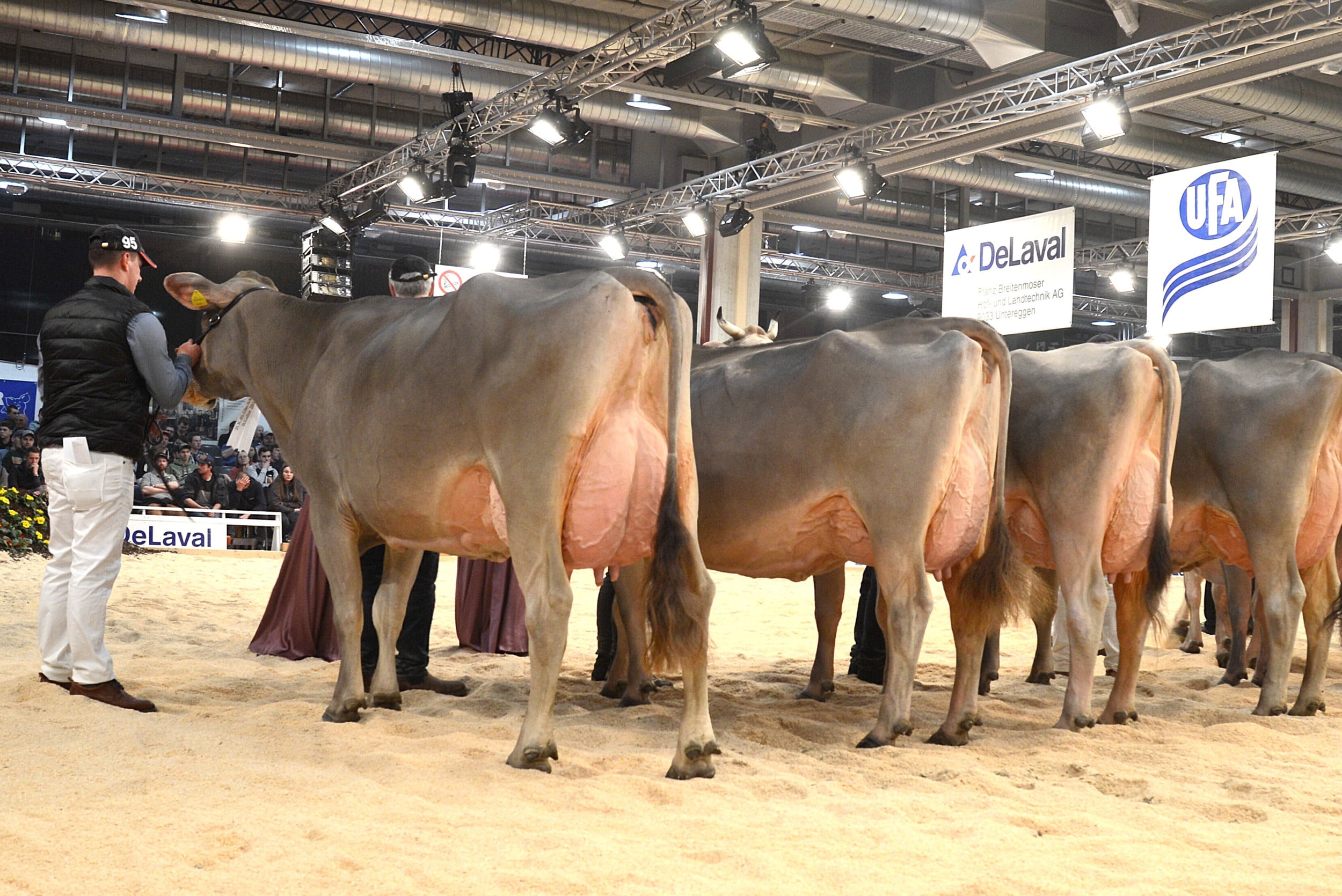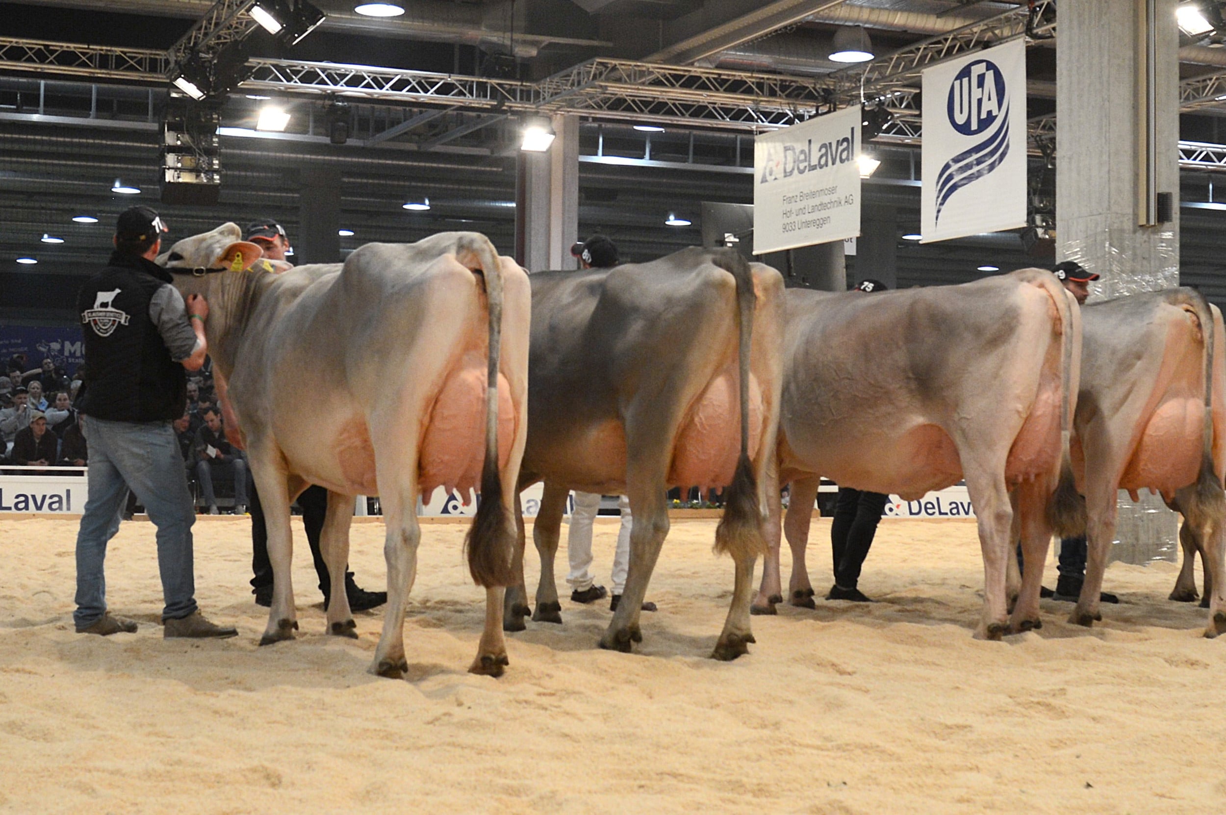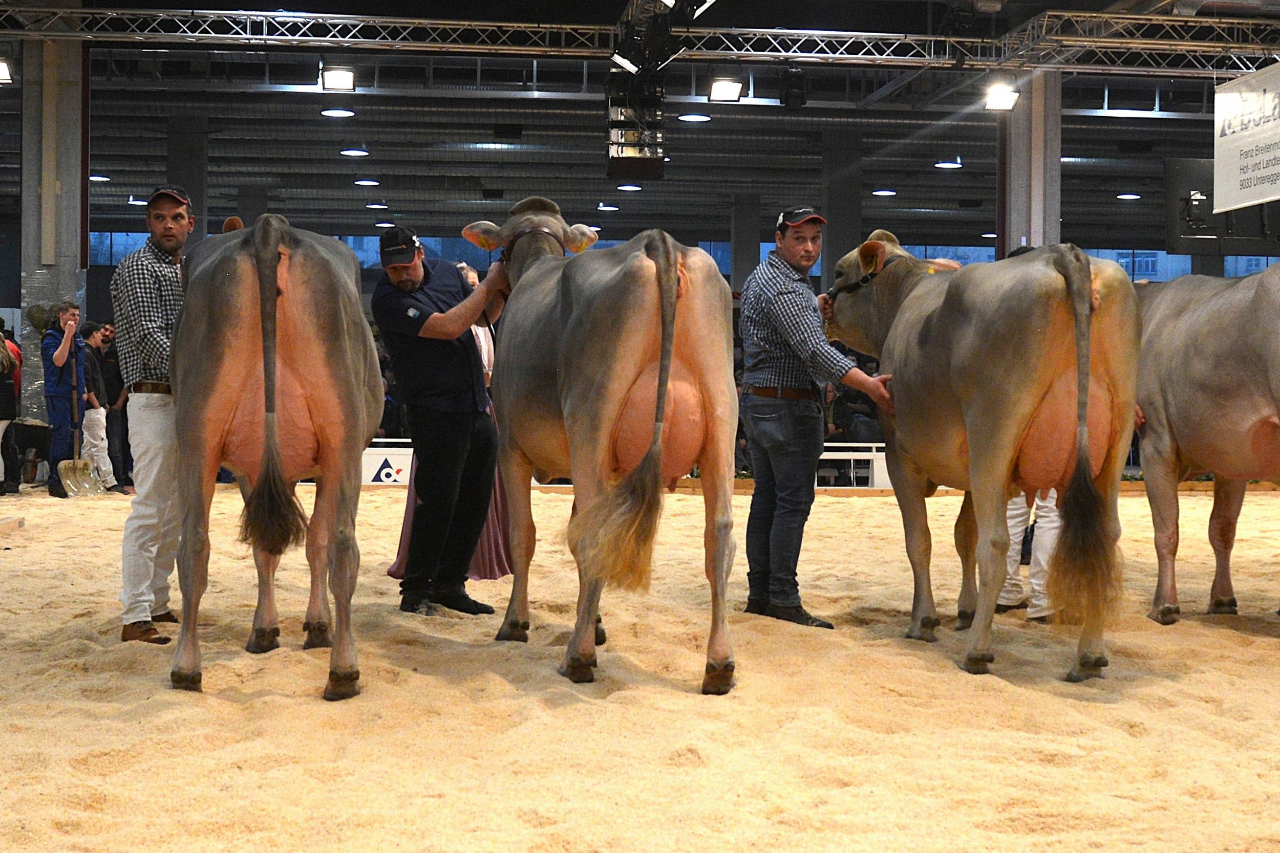 Nach dem Rangieren der älteren Kühe richteten sich alle Blicke auf den ersten Höhepunkt des Abends: die Wahl zur Junior-Schöneutersiegerin. Die Spannung in der Halle war spürbar, denn die besten Euter der ersten Laktation standen sich noch einmal direkt im Ring gegenüber.