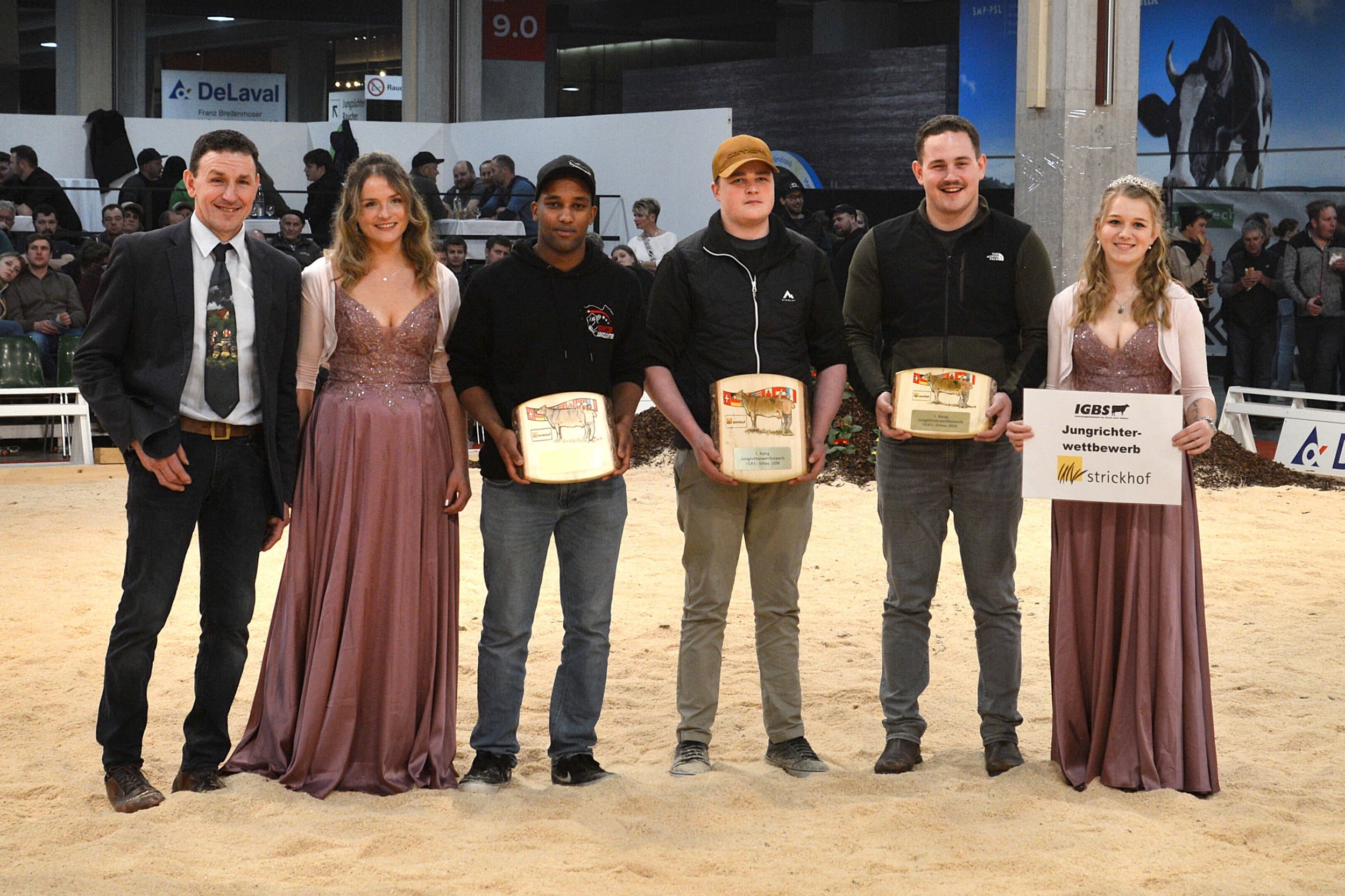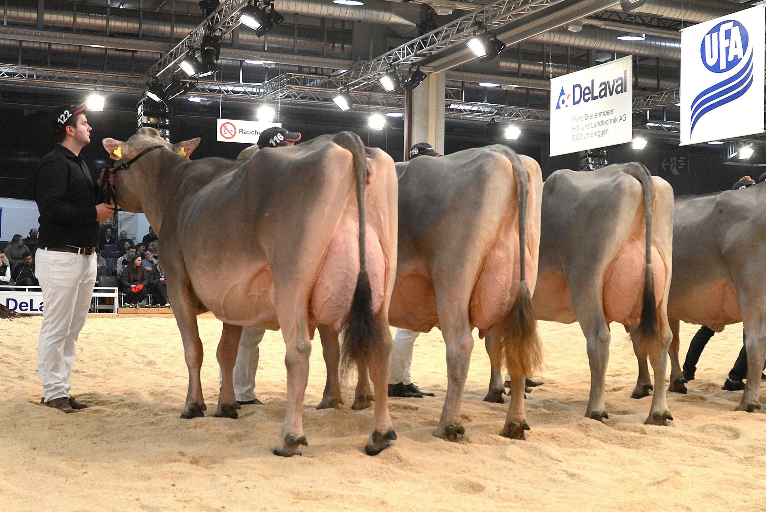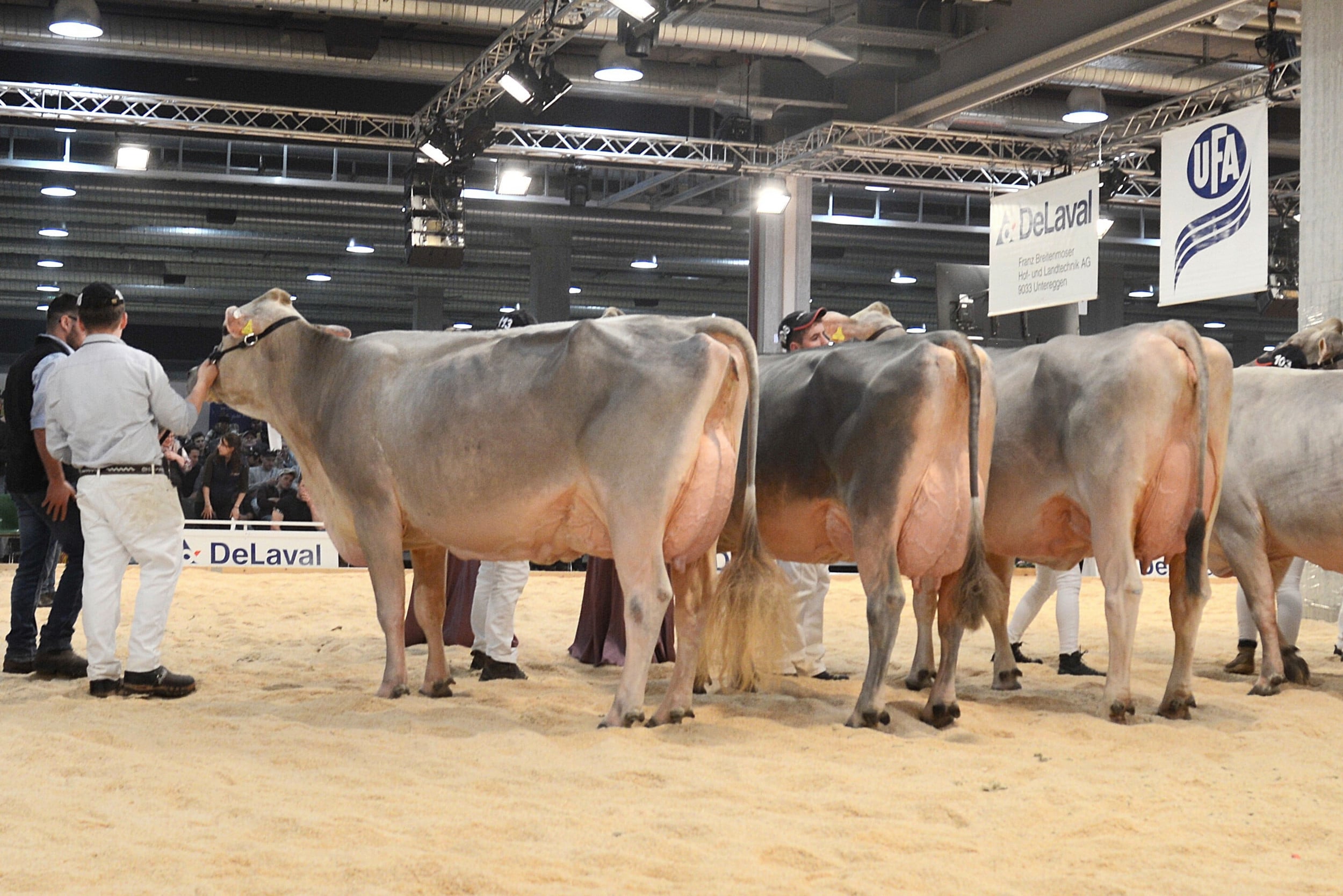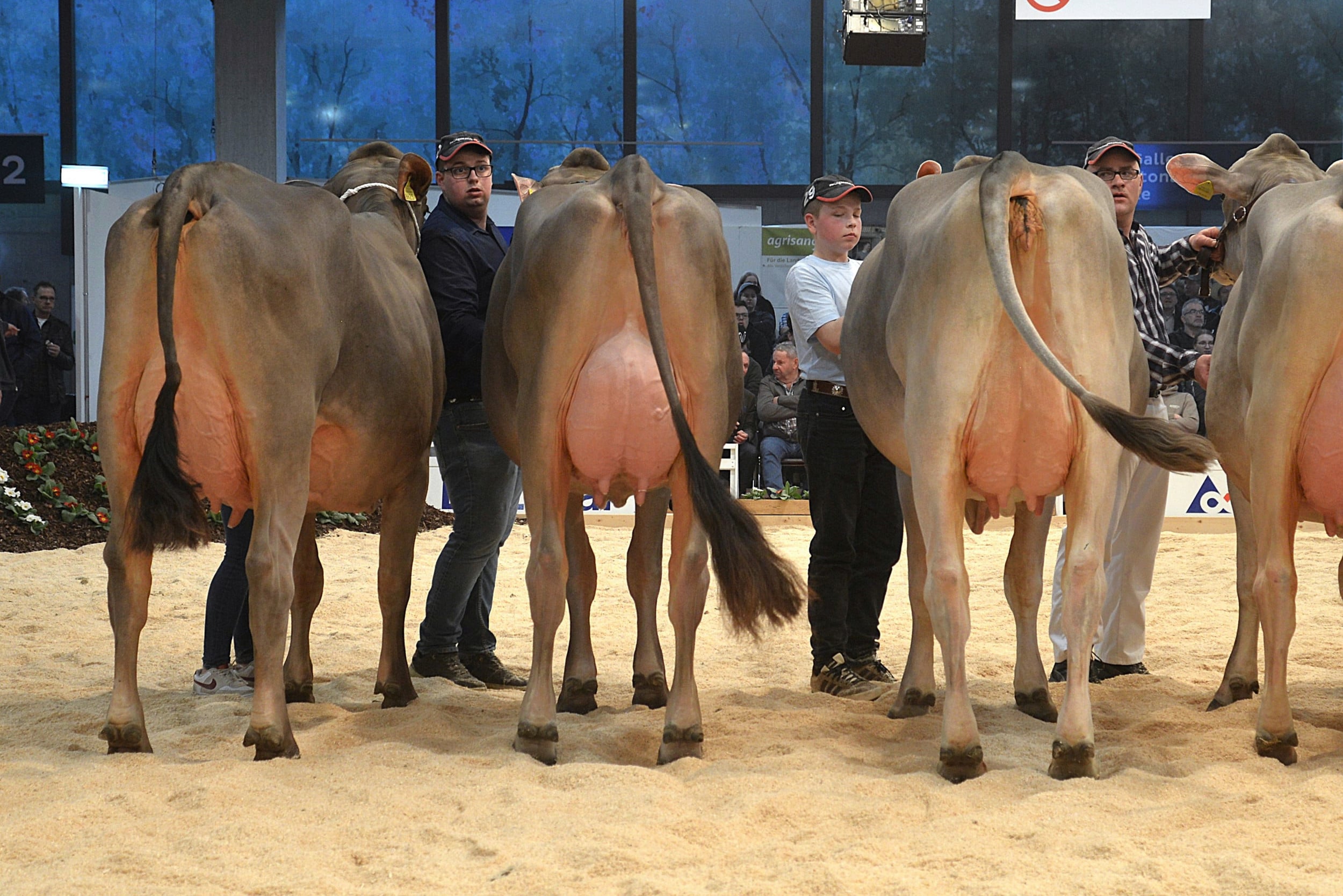 Nach dem Rangieren der älteren Kühe richteten sich alle Blicke auf den ersten Höhepunkt des Abends: die Wahl zur Junior-Schöneutersiegerin. Die Spannung in der Halle war spürbar, denn die besten Euter der ersten Laktation standen sich noch einmal direkt im Ring gegenüber.