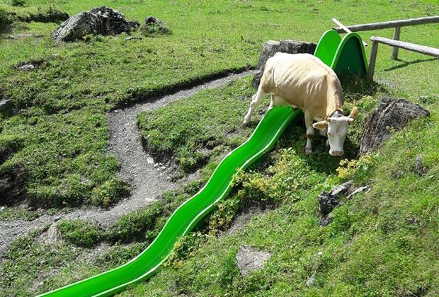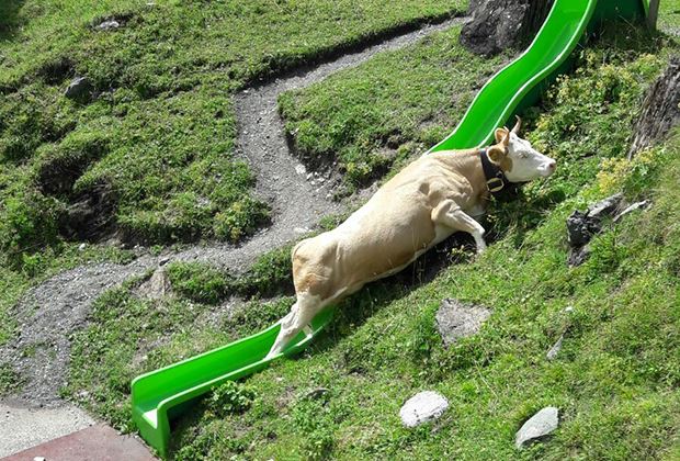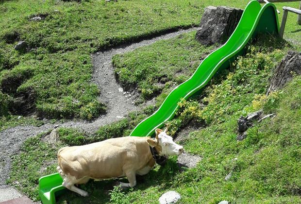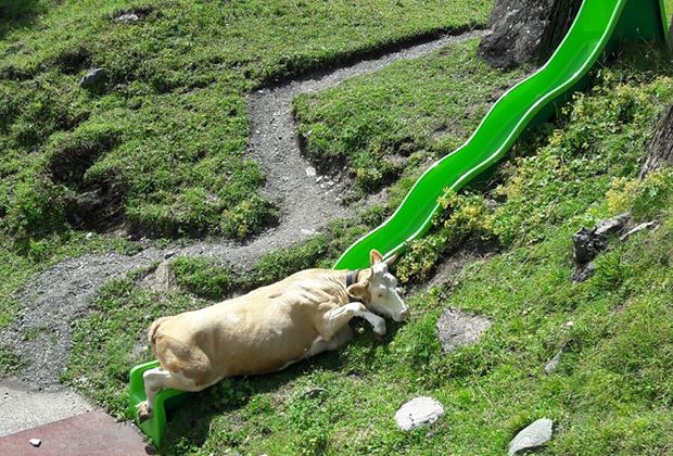 An einem schönen Sommertag, oberhalb von Kandersteg BE beim Oeschinensee geniesst Kuh Veiel das frische Berggras. Doch die Simmentalerkuh will anscheinend mehr als nur sömmern. Sie gerät auf die Rutschbahn beim Panorama-Restaurant zur Sennhütte am Oeschinensee.