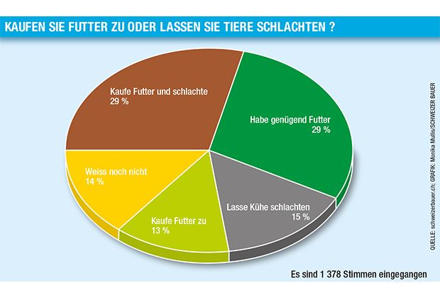 Gemäss einer nicht repräsentativen Umfrage auf www.schweizerbauer.ch muss knapp ein Drittel der Abstimmenden aufgrund der Trockenheit Futter zukaufen und trotzdem den Tierbestand mittels Schlachten verkleinern.