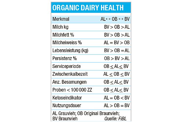 Bei der Milchleistung lag das BV mit 6132 kg vor dem OB mit 5503 kg und dem AL mit 4541 kg. Auch bei der Lebensleistung lag das BV mit 26'844kg vor den Zweinutzungsrassen OB mit 22'867 und AL mit 20'742kg. Anders präsentierten sich die Ergebnisse bei den Merkmalen, die nicht direkt mit der absoluten Leistung zusammenhängen. Hier schnitten die Zweinutzungsrassen in der Schweiz durchgehend besser ab (siehe Tabelle).