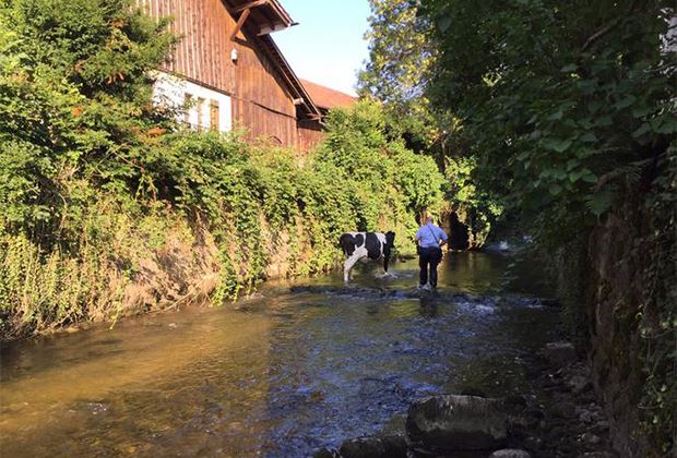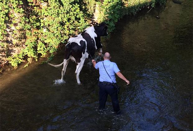Am Samstagabend benachrichtigten Anwohner die Stadtpolizei Uster ZH, weil sich eine Kuh im Aabach bei Uster befand. Zusammen mit Anwohner gelang es den Polizisten, die Kuh aus dem Bachbett zu führen.