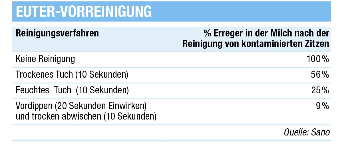 Laut vet-consult.de dürfen in der Herde höchstens 2 bis 10 Prozent der Euter- und Zitzenoberflächen sichtbar verschmutzt sein – bei maximal 90 Prozent der Kühe. Sind die Euter so sauber, brauchen Vormelken und trockene Zitzenreinigung 12 bis 18 Sekunden pro Kuh. Auch im Melkroboter senken saubere Euter die Reinigungszeit. Wenn rund 10 bis 30 Prozent der Zitzenoberflächen sichtbar verschmutzt sind, können Melkroboter an ihre Grenzen stossen. sum