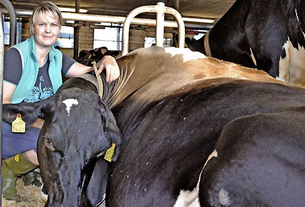 40 Kühe der Rassen Holstein und Red Holstein stehen im Stall der Betriebsgemeinschaft Wälchli-Huggler im aargauischen Vordemwald. Wenn Fabienne Huggler eine von ihnen trockenstellen will, tut sie das auf eine ganz spezielle Weise: Sie spritzt keinen Trockensteller ins Euter, sondern flösst eine Flüssigkeit ein.