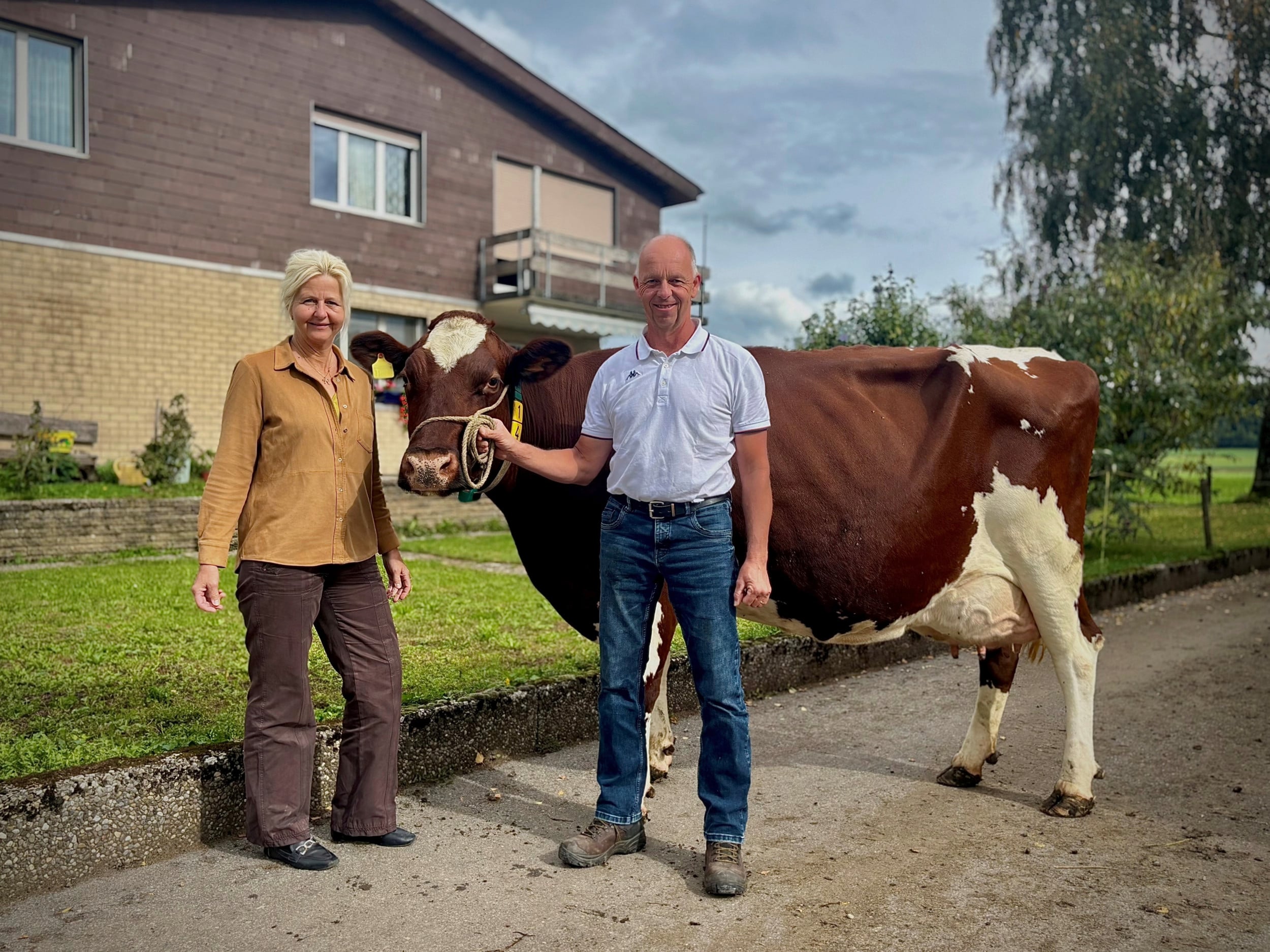 Adrian Weber, Präsident von Swissherdbook, mit der SF-Kuh Odyssey Carmen. Links von ihm steht Ehefrau Jacqueline Weber.