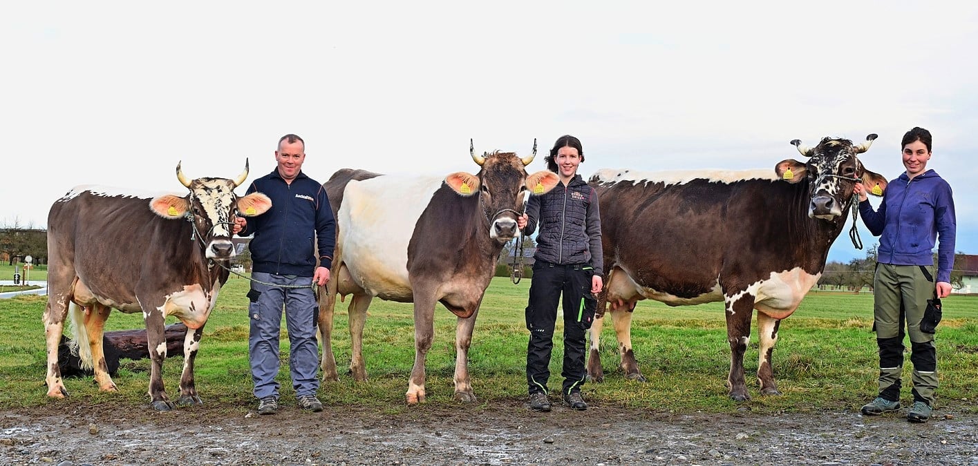 Romeo Wildhaber mit Arrow Arnika, Seraina Wildhaber mit Balou Gurt Balda und Mitarbeiterin Martina Kathriner mit Fido Fina (von links). Alle drei Kühe haben schon an Schauen gewonnen.