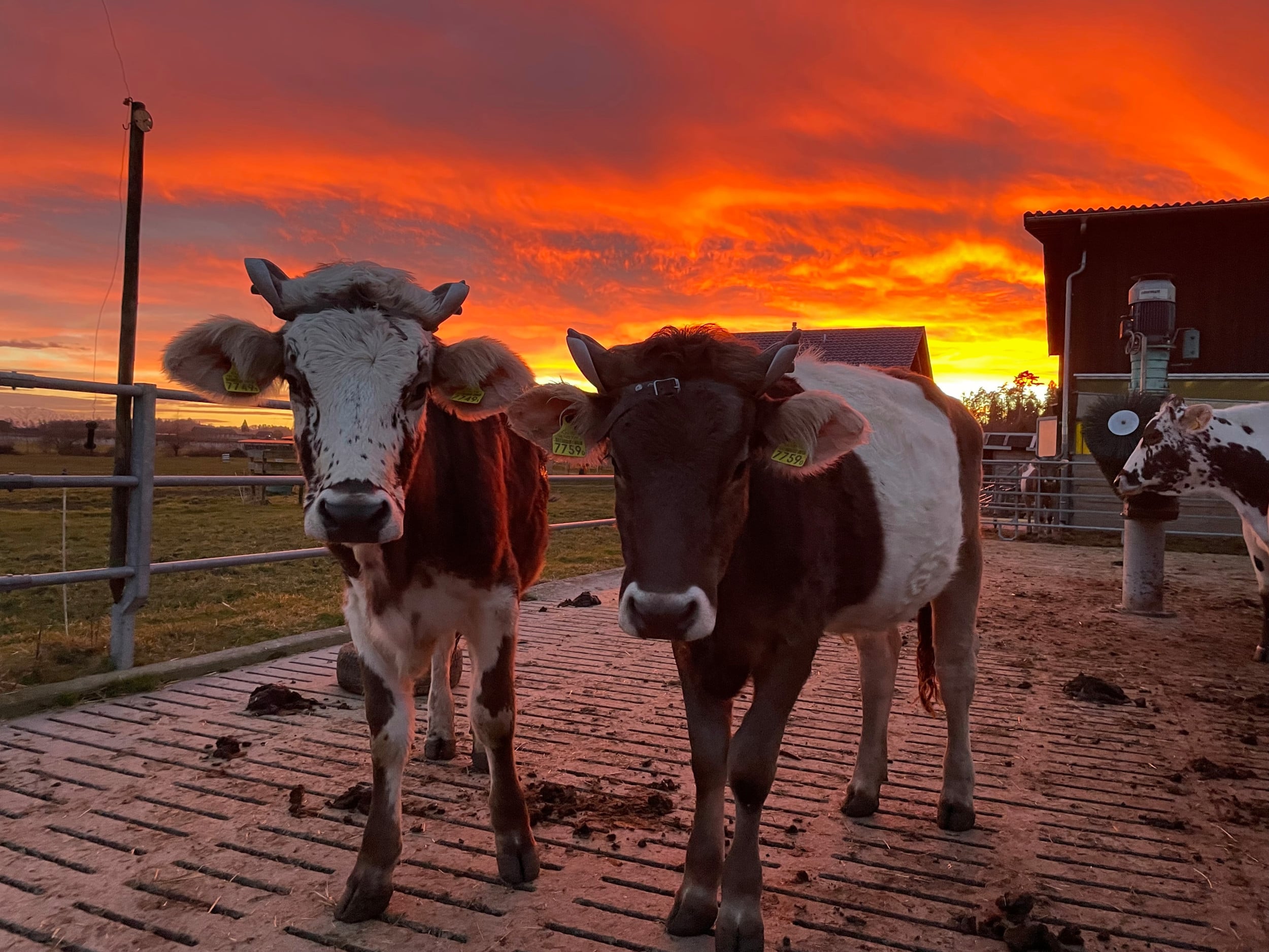 Himalaya und Tamara mit feurigem Abendrot auf dem Hof von Romeo Wildhaber in Schocherswil.