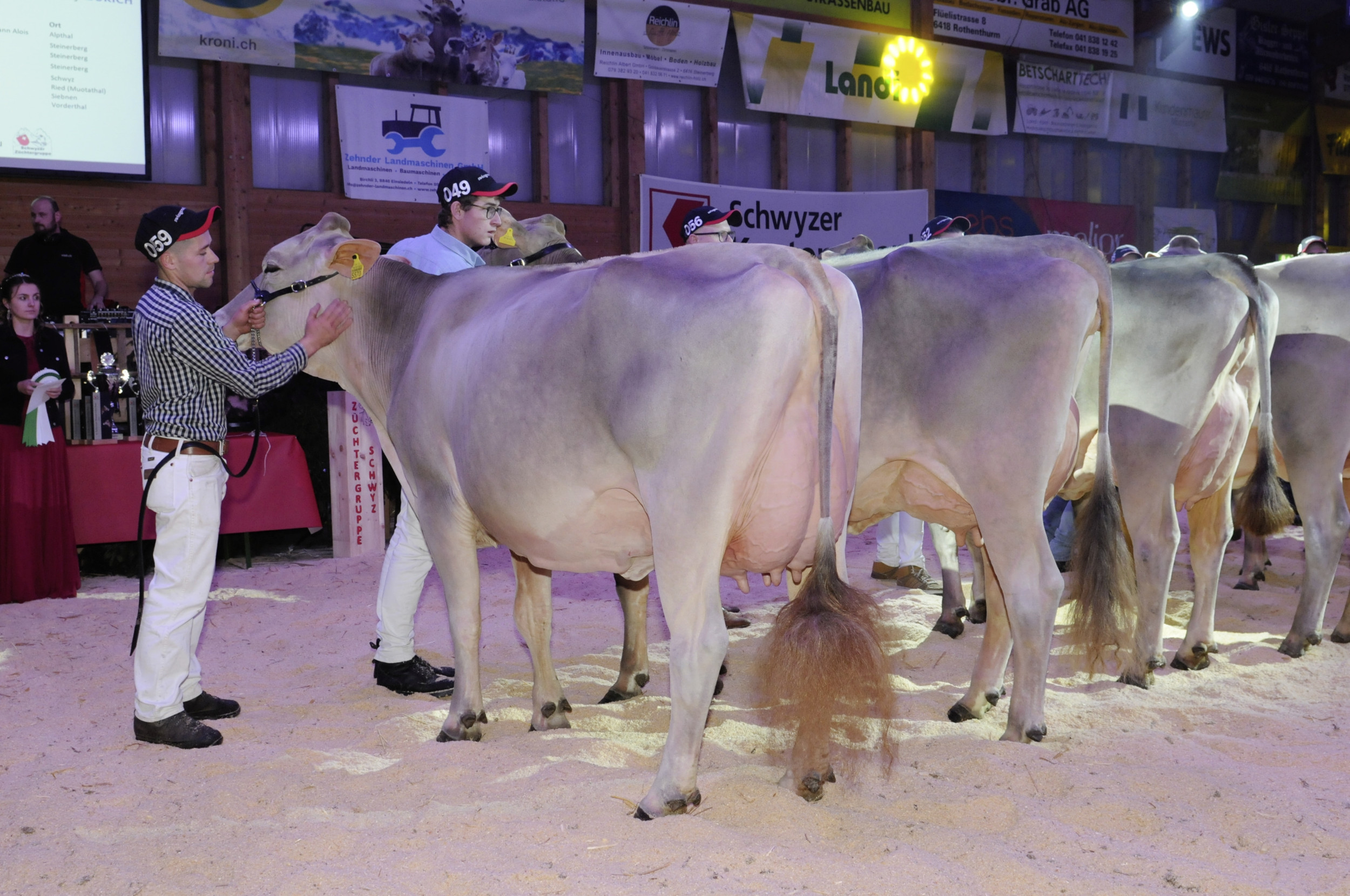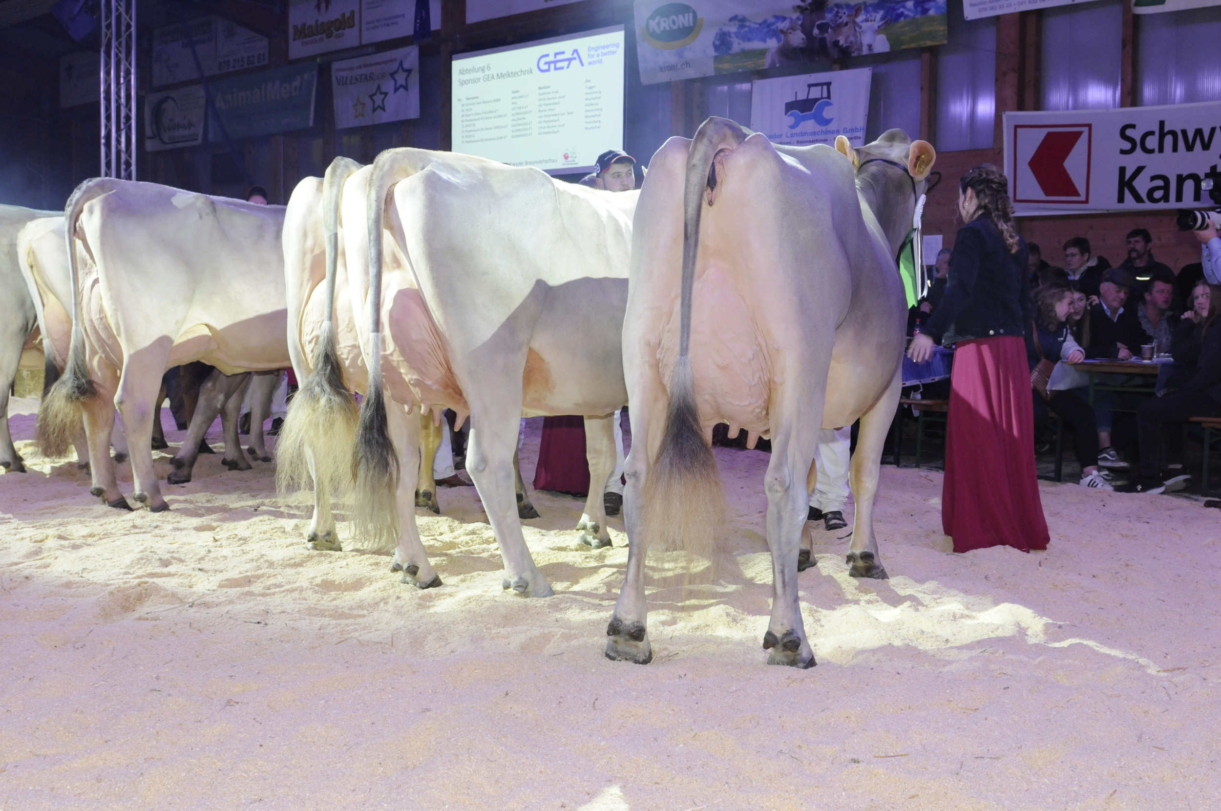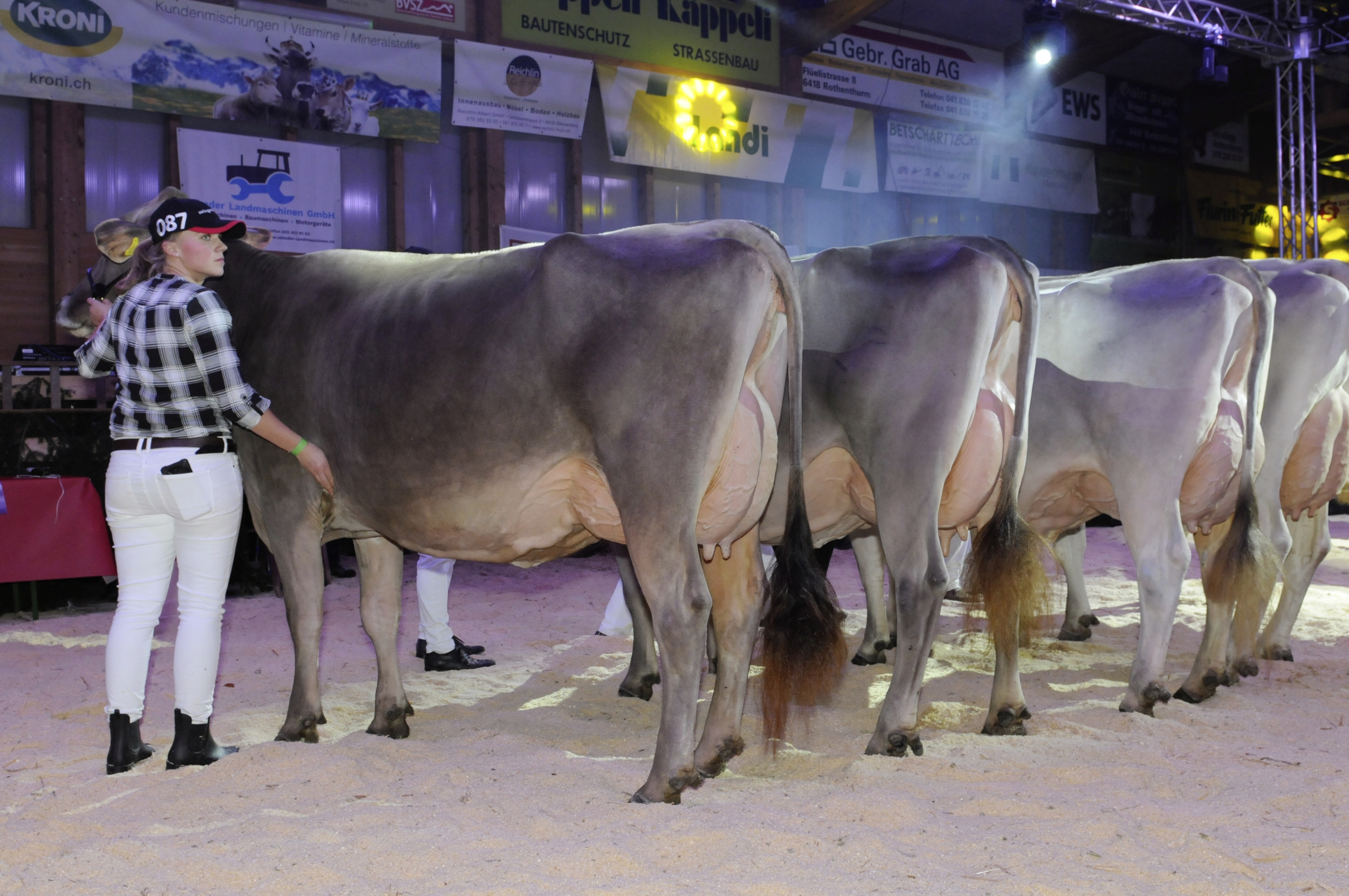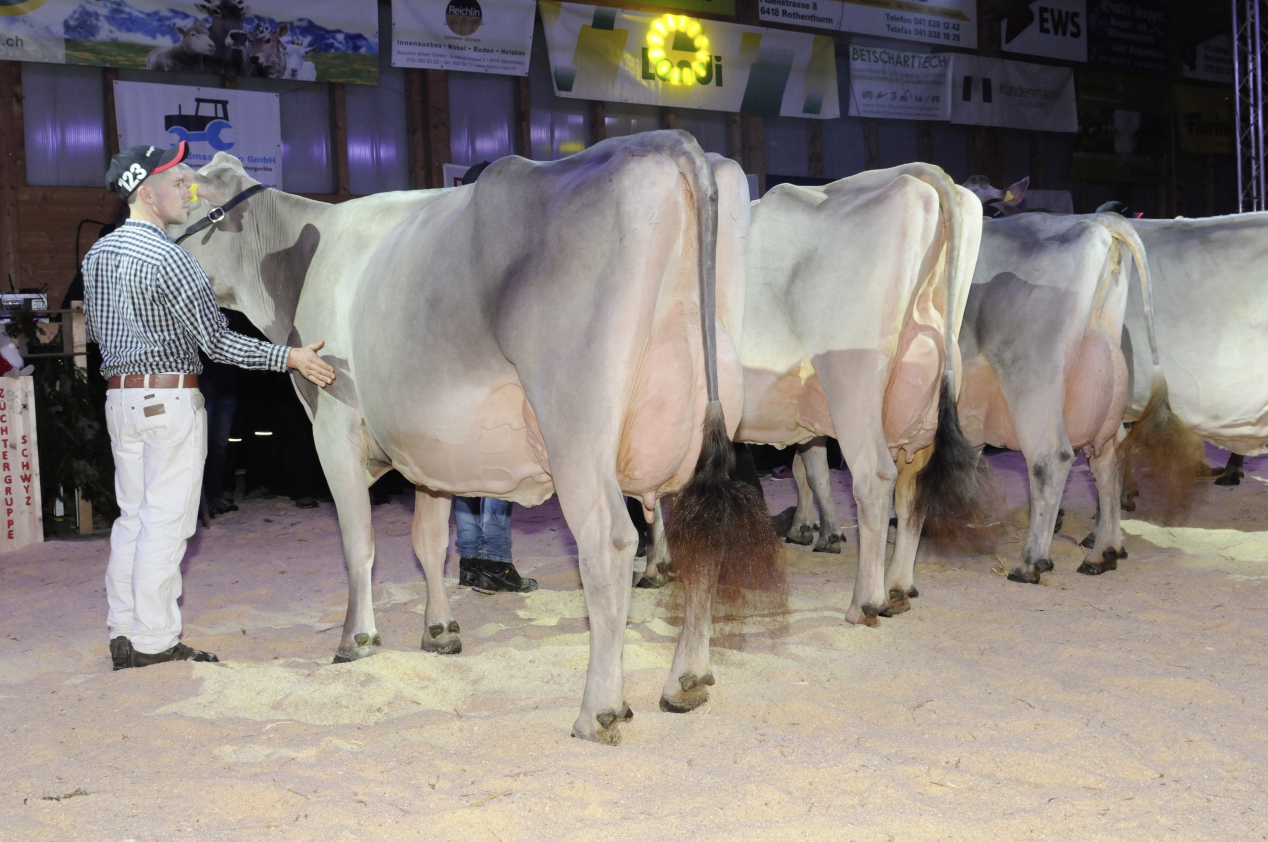 Schon nach 4 Abteilungen mit hervorragenden Erstmelkkühe standen bereits die ersten Höhepunkte des Abends an. Schöneutersiegerin wurde Rickenbach Bormio Elea von Beat von Rickenbach, Steinerberg vor Kennel’s Jeff Jasmin von Markus Kennel, Steinerberg und Holdrio Arve, Peter Büeler, Wollerau. Die Siegerin Elea hat ein sehr hohes Euter, der Euterboden ist hoch über dem Sprunggelenk und die Voreuterverbindung sehr stark.
