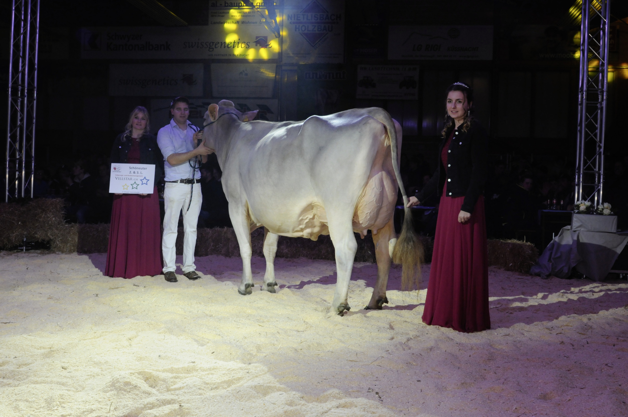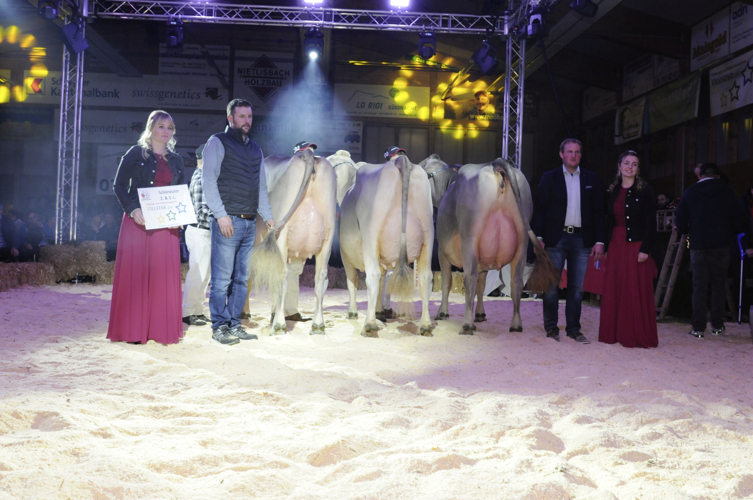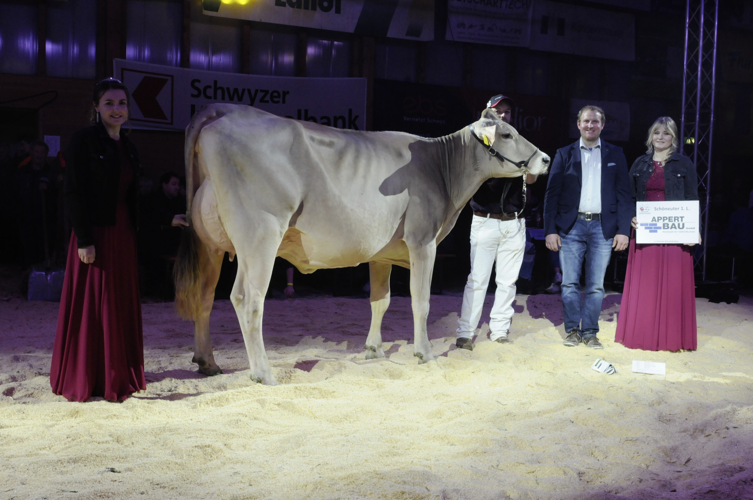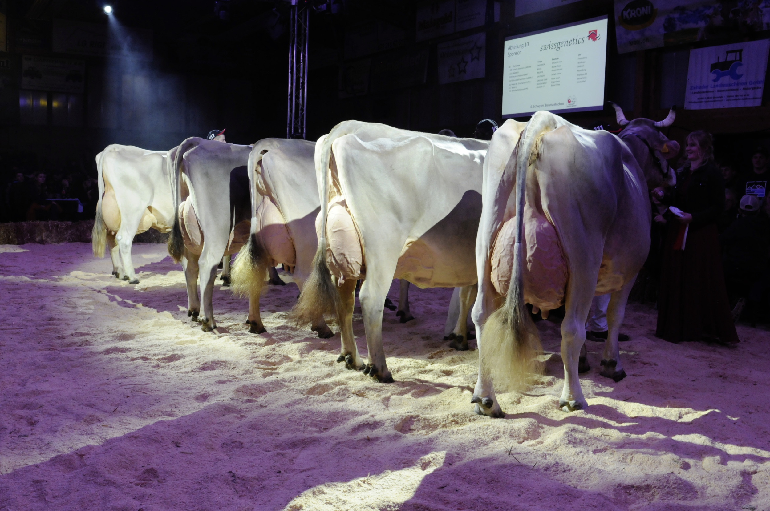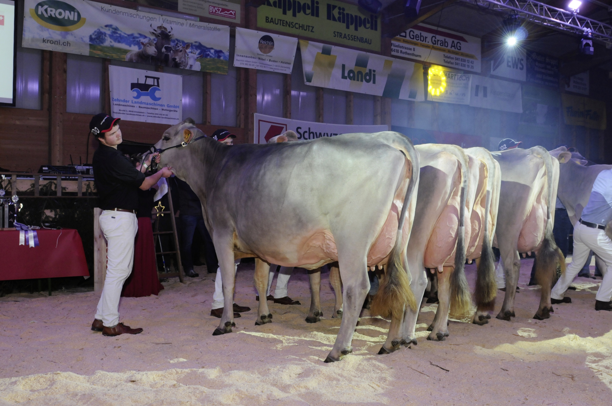 Schon nach 4 Abteilungen mit hervorragenden Erstmelkkühe standen bereits die ersten Höhepunkte des Abends an. Schöneutersiegerin wurde Rickenbach Bormio Elea von Beat von Rickenbach, Steinerberg vor Kennel’s Jeff Jasmin von Markus Kennel, Steinerberg und Holdrio Arve, Peter Büeler, Wollerau. Die Siegerin Elea hat ein sehr hohes Euter, der Euterboden ist hoch über dem Sprunggelenk und die Voreuterverbindung sehr stark.