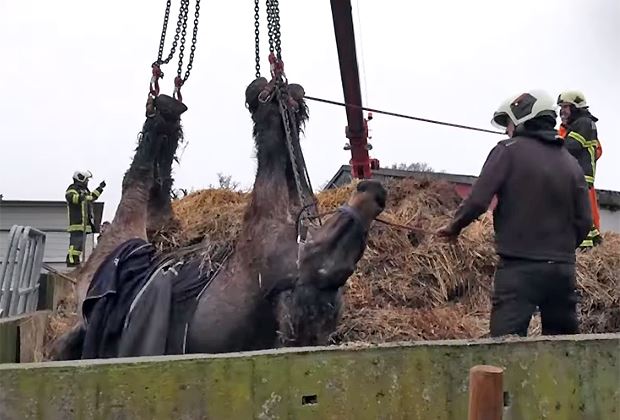 Ein Video des WDR zeigt, wie das Pferd kopfüber mit Ketten an den Beinen aus dem Mist gezogen werden musste. Wie das Tier in den Misthaufen gelangte, war zunächst unklar.