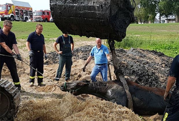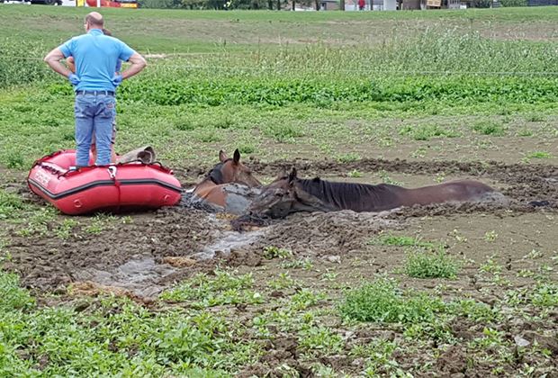 Am Mittwochmorgen gerieten zwei Pferde in Düffelward im Nordwesten von Nordrhein-Westfalen (D) in einen vermeintlich ausgetrockneten Kolk, eine kleine, wassergefüllte Vertiefung. Die beiden Pferde steckten bis zum Hals im Morast fest und konnten sich selbst nicht mehr aus der misslichen Lage befreien. Wie die Feuerwehr Kleve berichtet, gestaltete sich die Rettung schwierig und dauerte letztlich fast 3,5 Stunden.