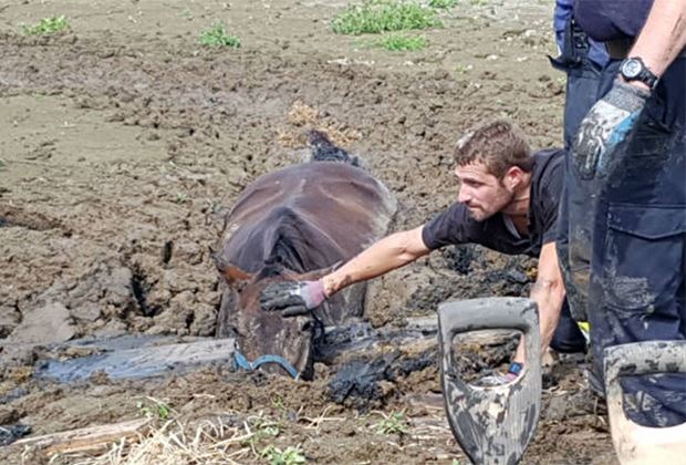 Wegen des aufgeweichten Bodens sei das Vordringen zu den eingesunkenen Pferden sehr schwierig gewesen. Der herbeigerufene Tierarzt konnte zunächst nur per Schlauchboot an die Tiere heran. Durch ein ortsansässiges Tiefbauunternehmen wurden mehrere Bagger an der Einsatzstelle aufgestellt. Zur Stabilisierung des Untergrundes wurden Metallplatten angefordert.